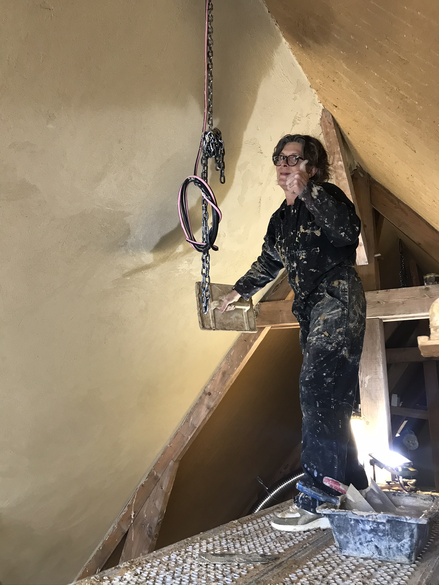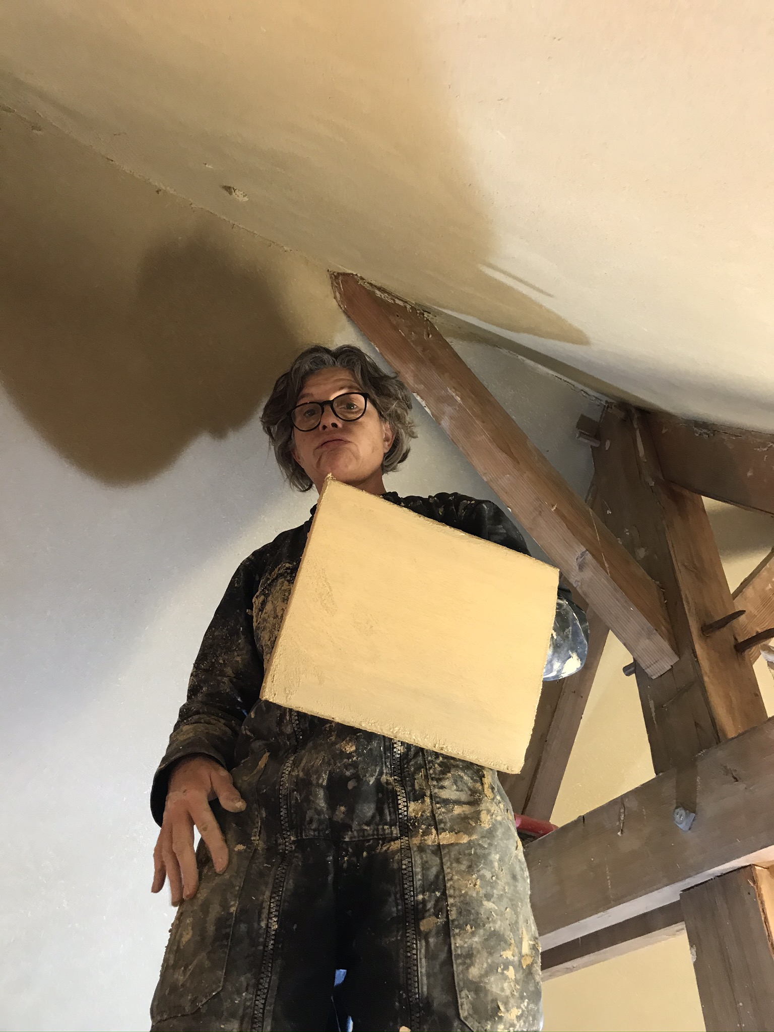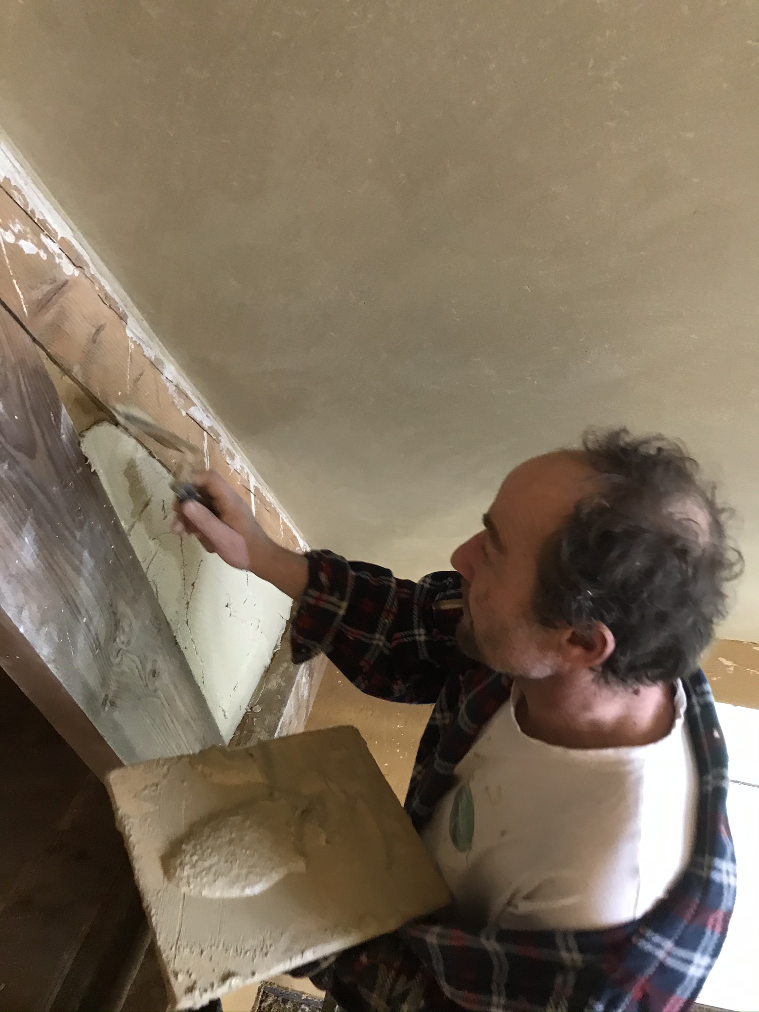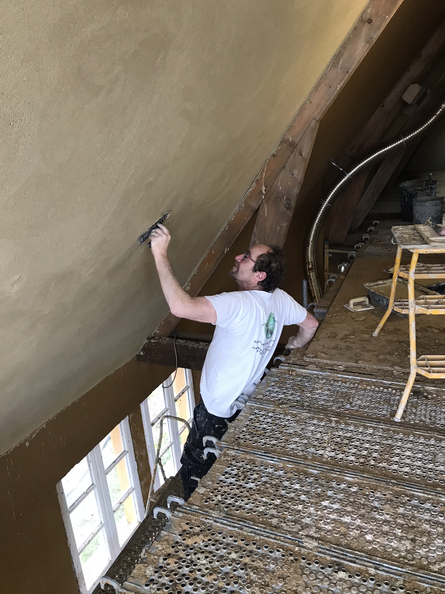 - La partie "cathédrale" de la pièce principale de Terre-Tous a reçu sa troisième et dernière passe de terre, en teinte "sable". Cela a permis de retirer l'échafaudage qui occupait cette pièce depuis plusieurs mois, permettant de profiter beaucoup plus de cet espace et de sa vue. Le résultat est très réussi et impressionnant. Félicitons le duo Isa et Johann Degrave qui a œuvré toute la semaine, concentrés comme des athlètes sur leur course, pour arriver au bout de ce marathon ! J'ai été témoin de leur grande rigueur et exigence, et j'avoue ne pas m'être sentie à la hauteur pour contribuer... beaucoup trop délicat pour des novices.