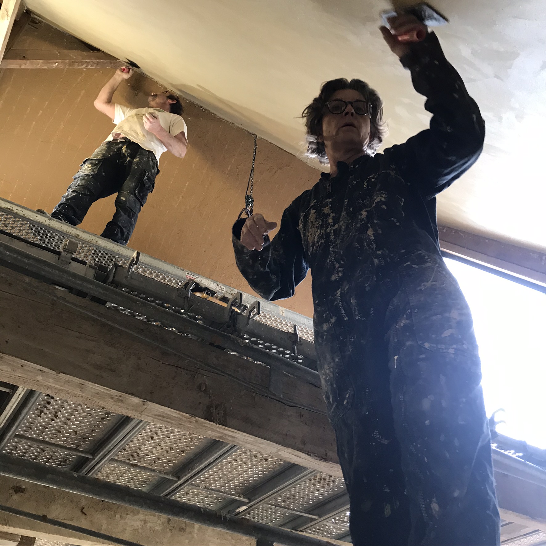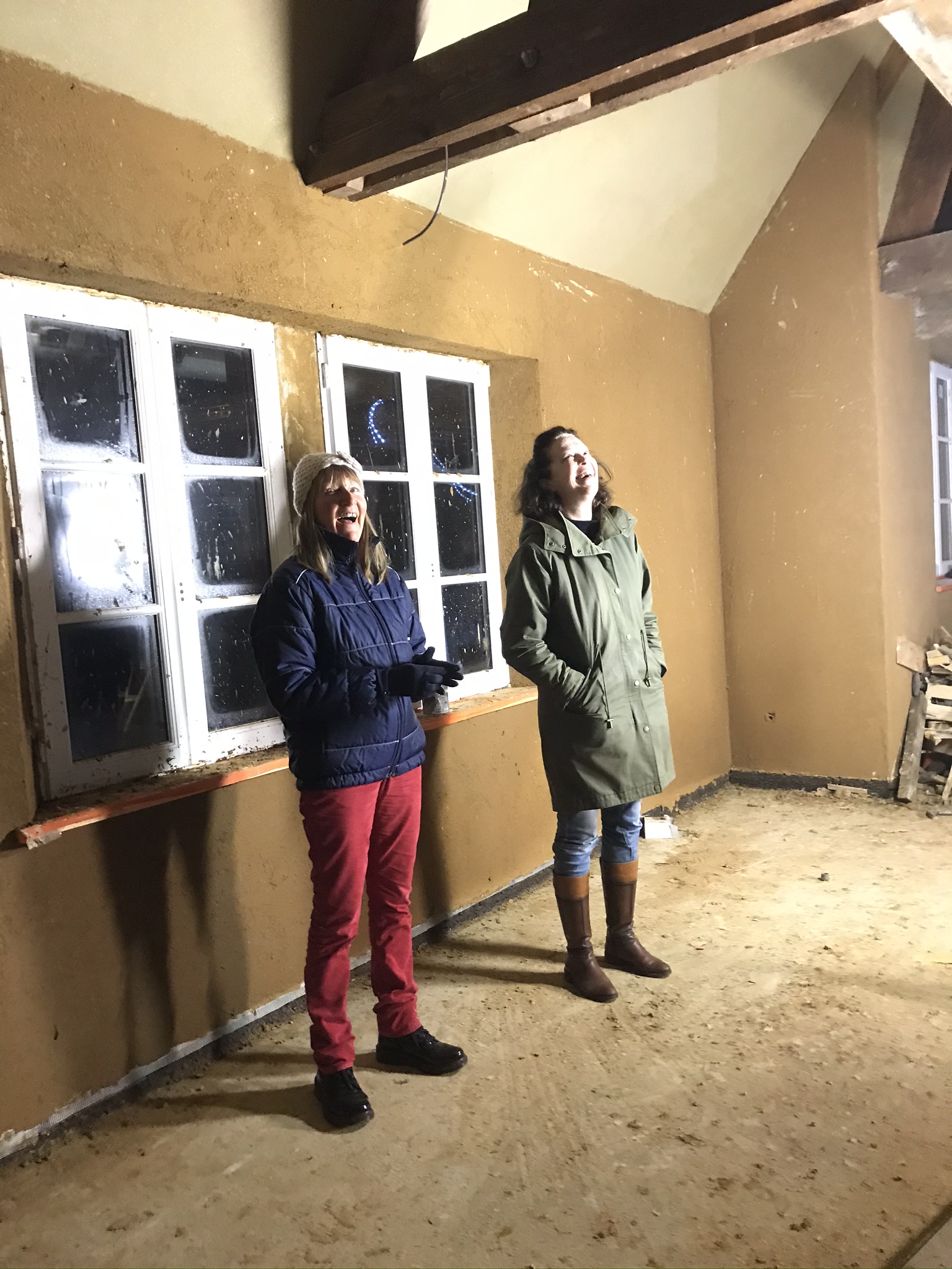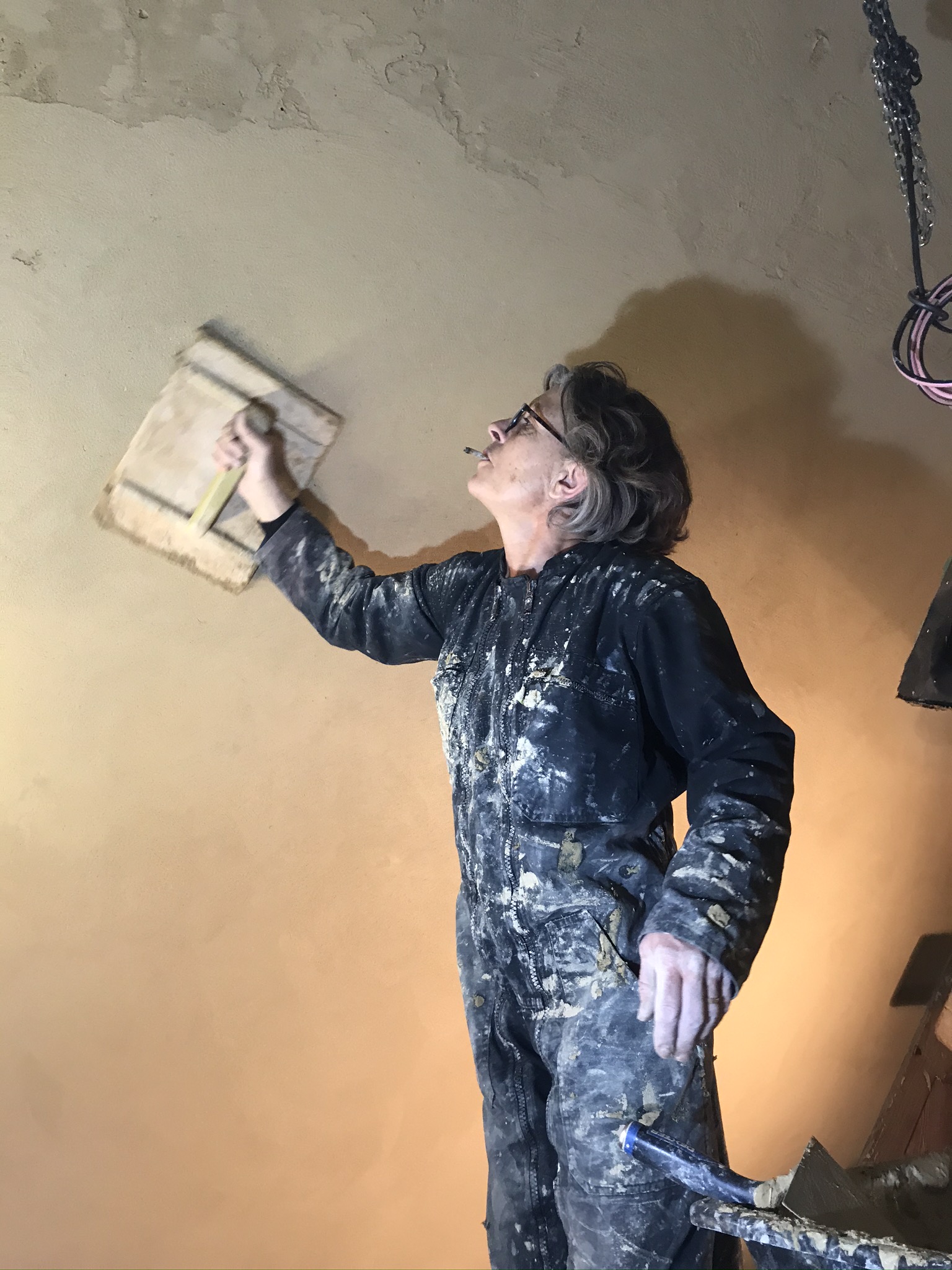 - La partie "cathédrale" de la pièce principale de Terre-Tous a reçu sa troisième et dernière passe de terre, en teinte "sable". Cela a permis de retirer l'échafaudage qui occupait cette pièce depuis plusieurs mois, permettant de profiter beaucoup plus de cet espace et de sa vue. Le résultat est très réussi et impressionnant. Félicitons le duo Isa et Johann Degrave qui a œuvré toute la semaine, concentrés comme des athlètes sur leur course, pour arriver au bout de ce marathon ! J'ai été témoin de leur grande rigueur et exigence, et j'avoue ne pas m'être sentie à la hauteur pour contribuer... beaucoup trop délicat pour des novices.