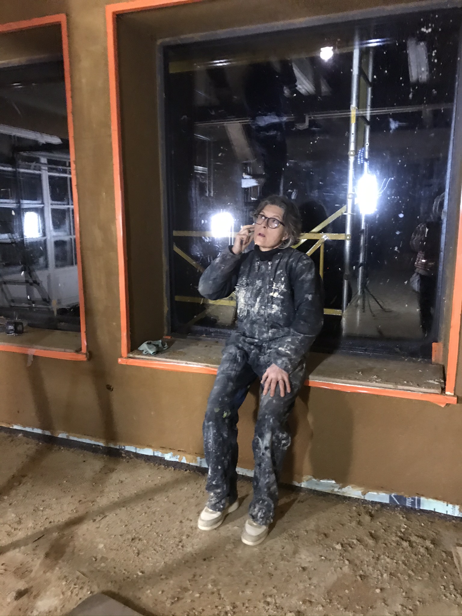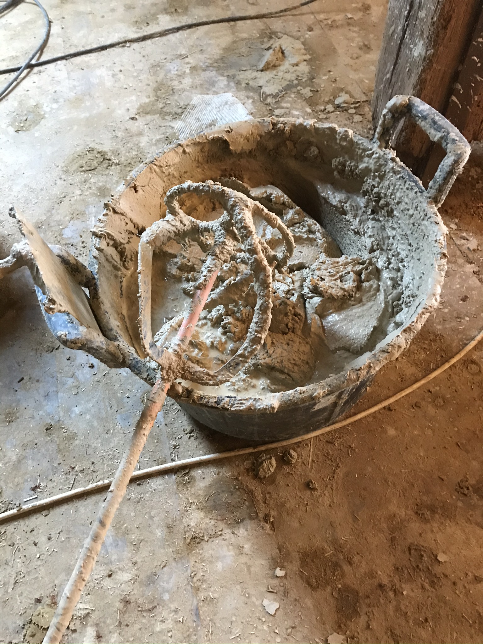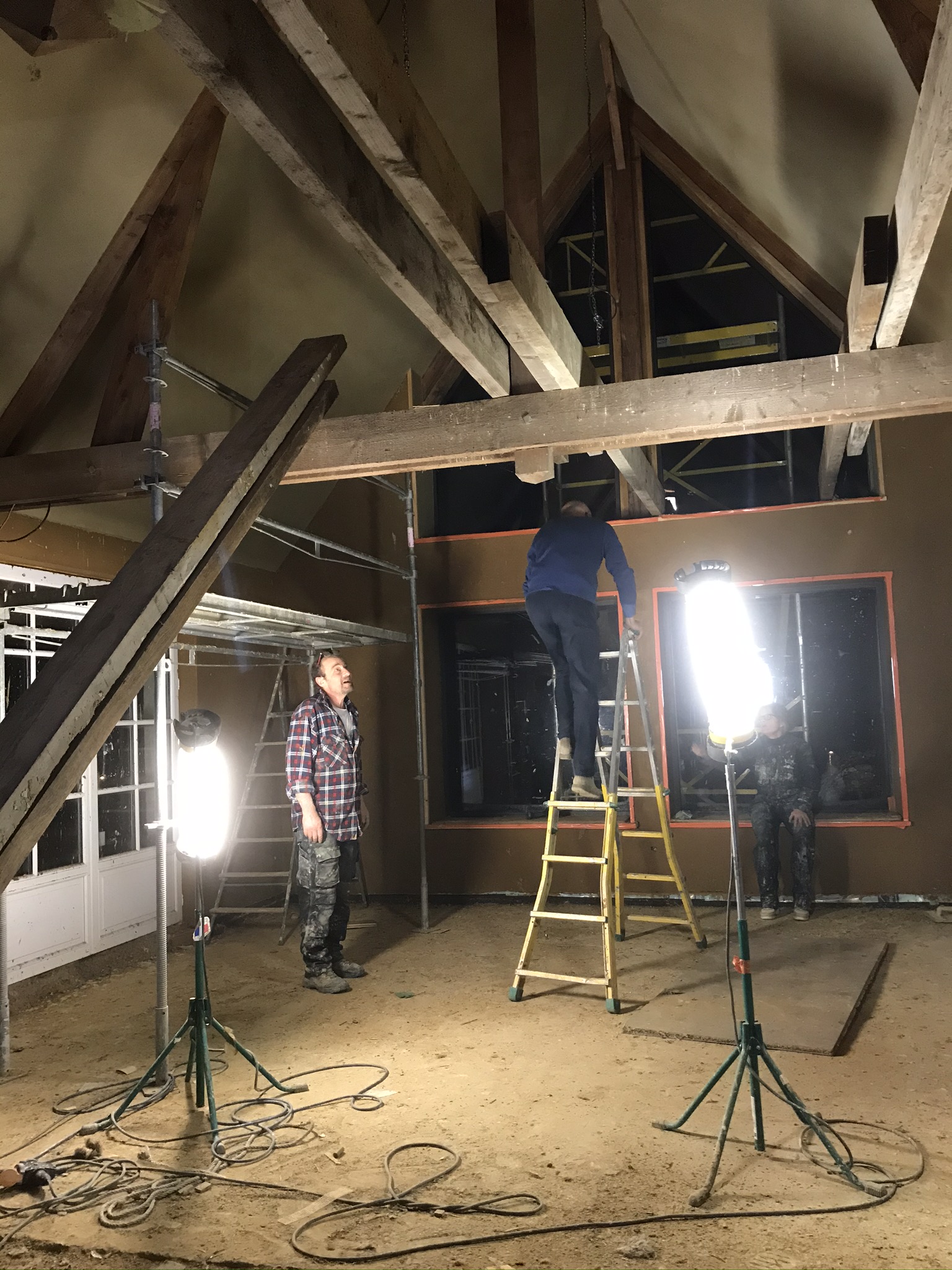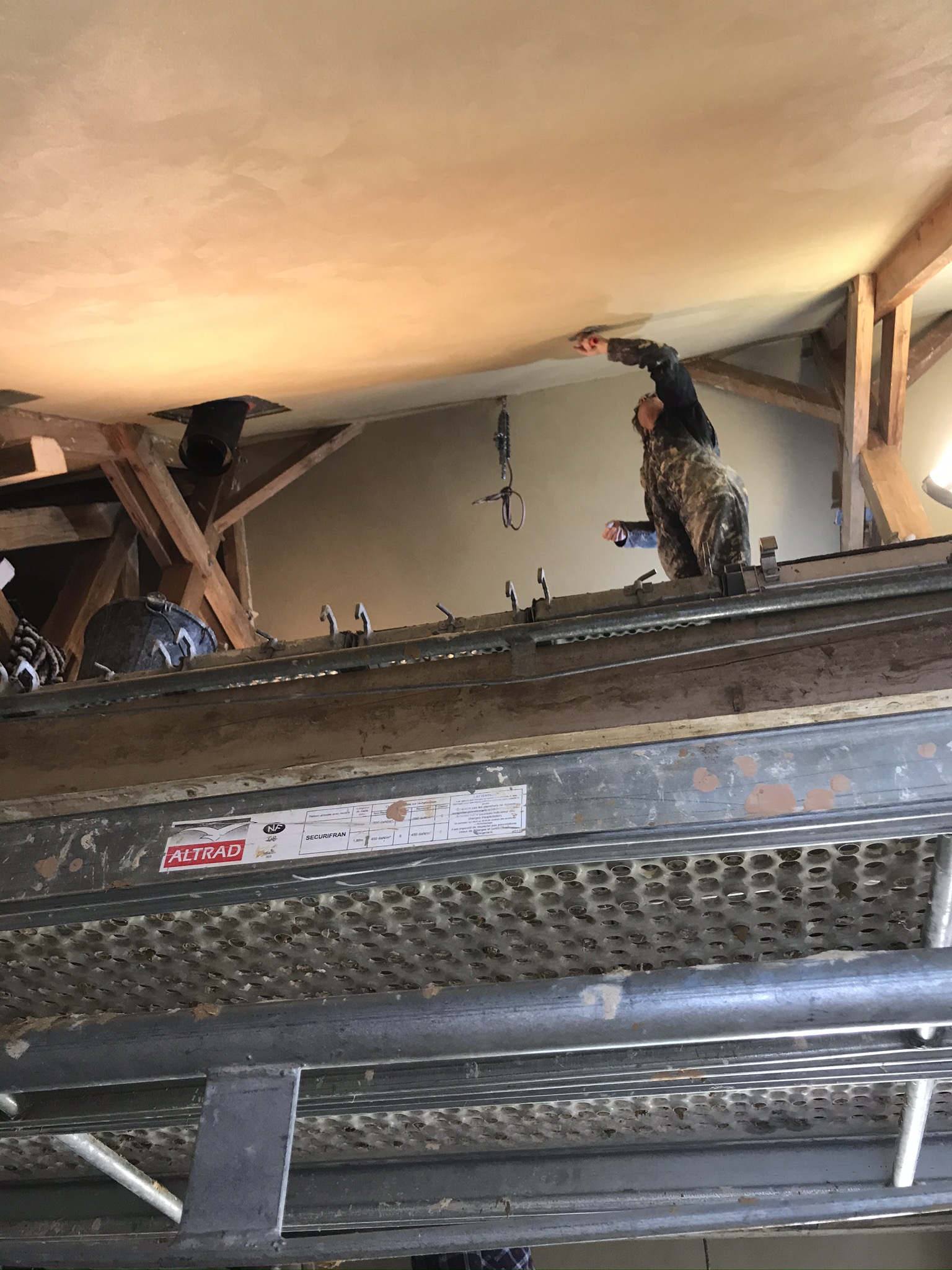 - La partie "cathédrale" de la pièce principale de Terre-Tous a reçu sa troisième et dernière passe de terre, en teinte "sable". Cela a permis de retirer l'échafaudage qui occupait cette pièce depuis plusieurs mois, permettant de profiter beaucoup plus de cet espace et de sa vue. Le résultat est très réussi et impressionnant. Félicitons le duo Isa et Johann Degrave qui a œuvré toute la semaine, concentrés comme des athlètes sur leur course, pour arriver au bout de ce marathon ! J'ai été témoin de leur grande rigueur et exigence, et j'avoue ne pas m'être sentie à la hauteur pour contribuer... beaucoup trop délicat pour des novices.