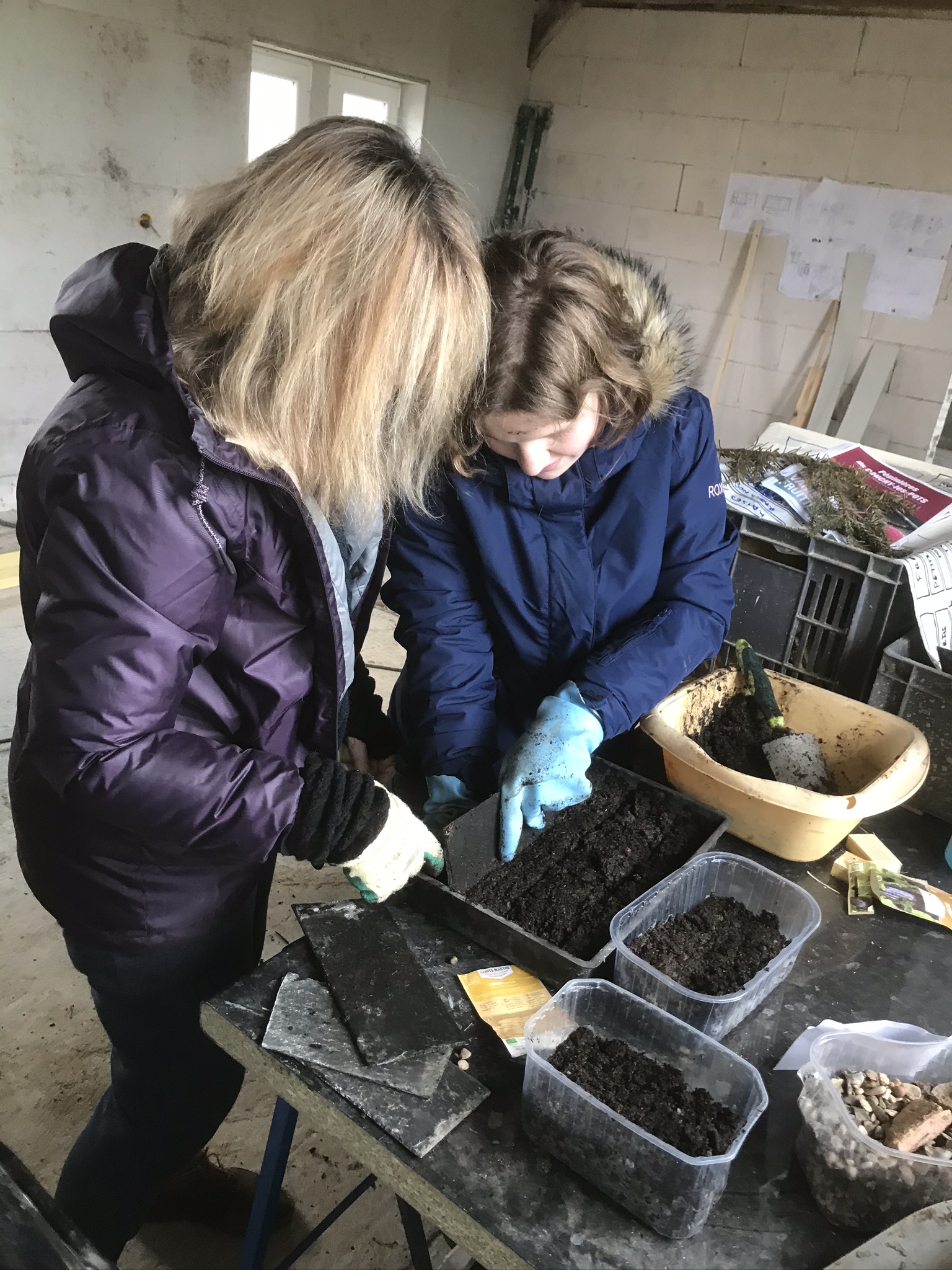 - Isabelle et Manon ont semé nos quelques graines de poivrons et aubergines. Il faut les garder du gel, et l'intérieur de Terre-Tous est peut-être adapté. On va tester...