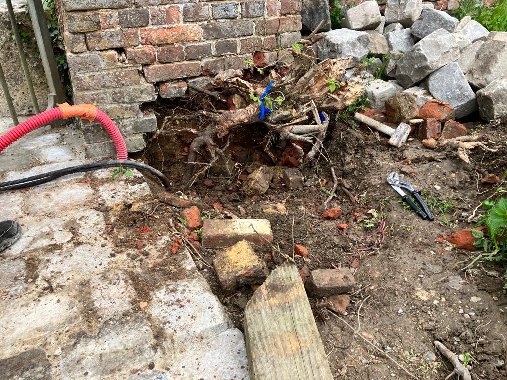 - Fin du dessouchage du noisetier, qui a fini par céder sans faire tomber la pile de briques, ouf.