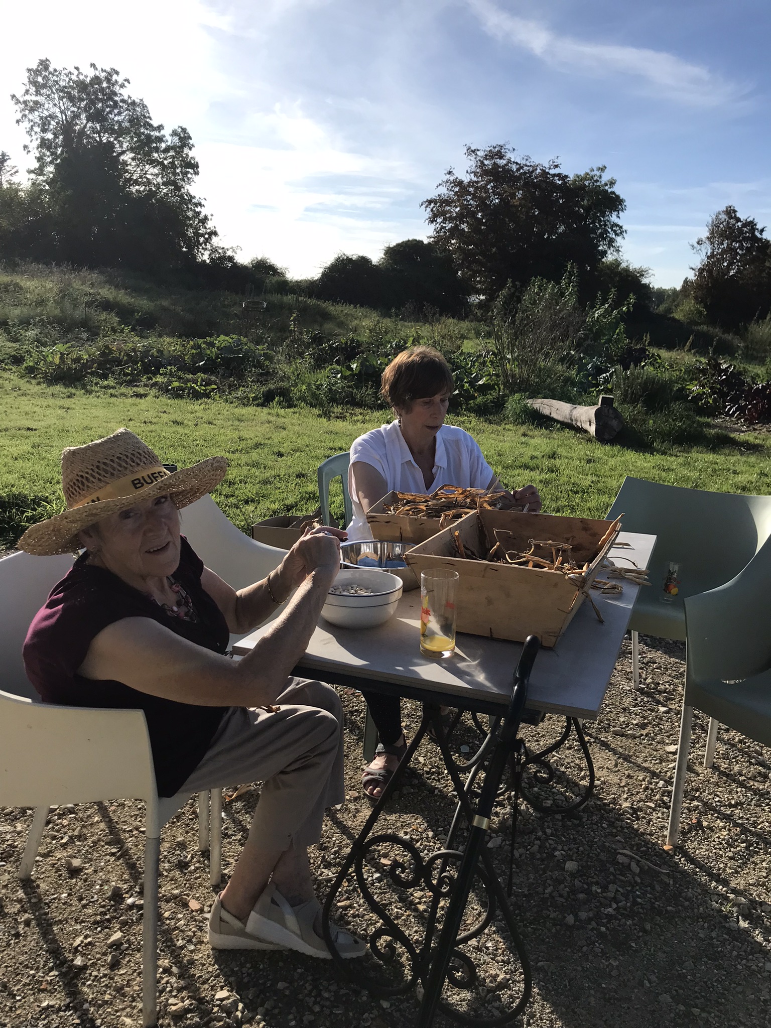 - Nous récupérons les graines. Ghislaine et Dominique s'y collent : arroche rouge, haricots verts et beurre. Vous pouvez nous en demander pour vos semis de l'an prochain.