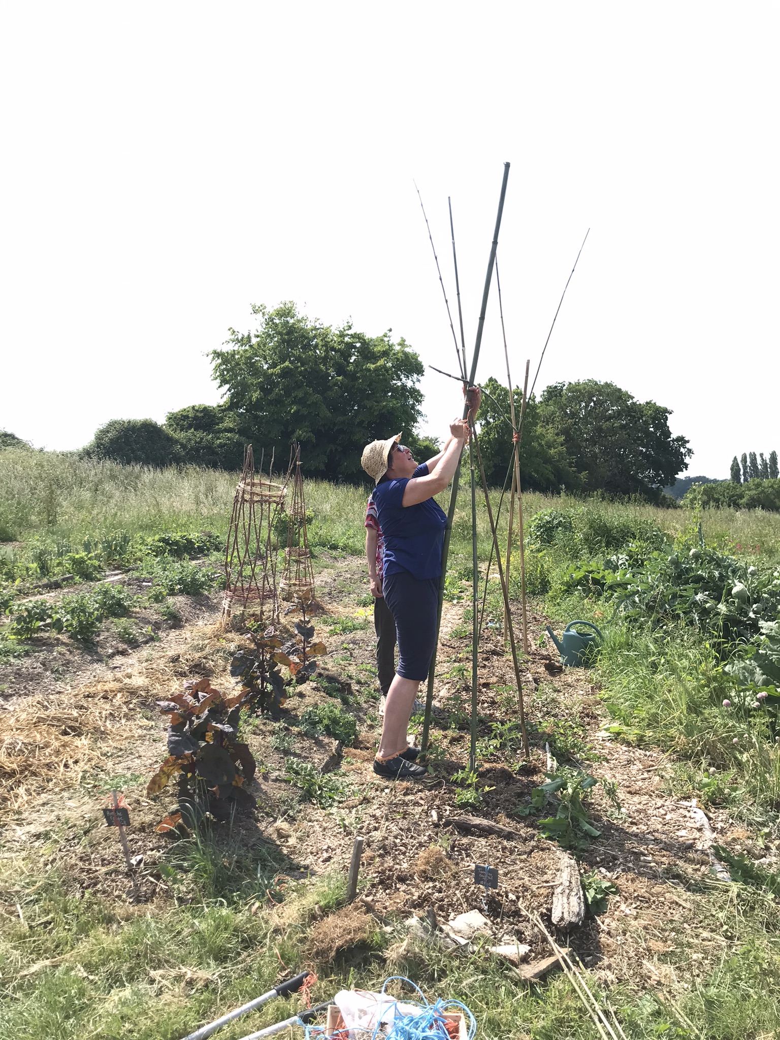 - Jordi a préparé les bambous récupérés chez Fred et Mijo, et chez Sylvie D., et monté de beaux trépieds pour tureurer les tomates avec Sylvie V. . Les haricots juste levés ont été plantés avec leur tuteurs également. Ces éléments hauts donnent une belle dimension au jardin avant même la pleine saison.