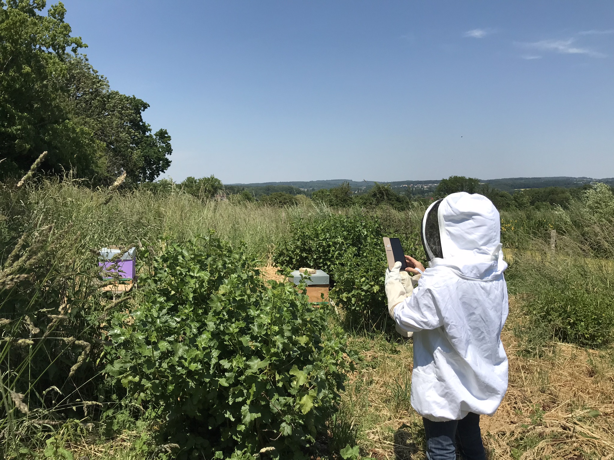 Brigitte et moi sommes allées jeter un œil dans les deux ruches de TT. La première semble s'en sortir ; le nombre d'abeilles n'est pas énorme, mais le couvain, promesse de futures abeilles, témoigne de la présence d'une reine et permet d'espérer qu'elles seront bientôt plus nombreuses. La deuxième, toute nouvelle, vivote. Nous n'y avons pas identifié de reine, mais les cadres se construisent... à suivre.
