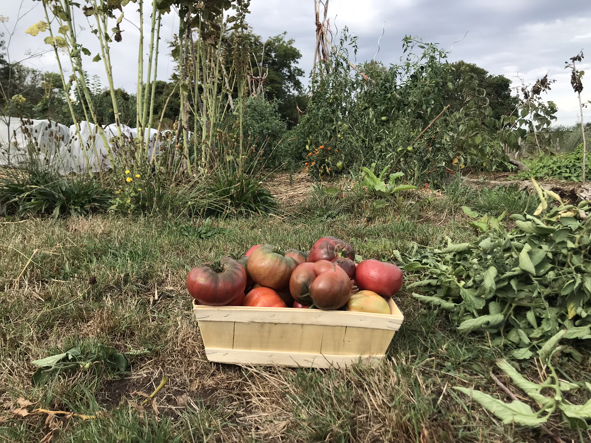 - Récoltes : encore beaucoup de tomates, oranges, rouges, blanches même ! grosses et pulpeuses, petites et juteuses, il y en a pour tous les goûts. Si vous ne venez pas en chercher, qu'en ferons-nous ? Seront-elles encore bonnes le 18 Septembre pour le "marché fermier" de l'écurie de Maximilien Micropoulos, pas certain...Notre système de tuteurs montre ses faiblesses face aux récentes pluies, j'essaie de redresser mais c'est comme un château de carte, les pieds et leurs tomates en sont fragilisés.
