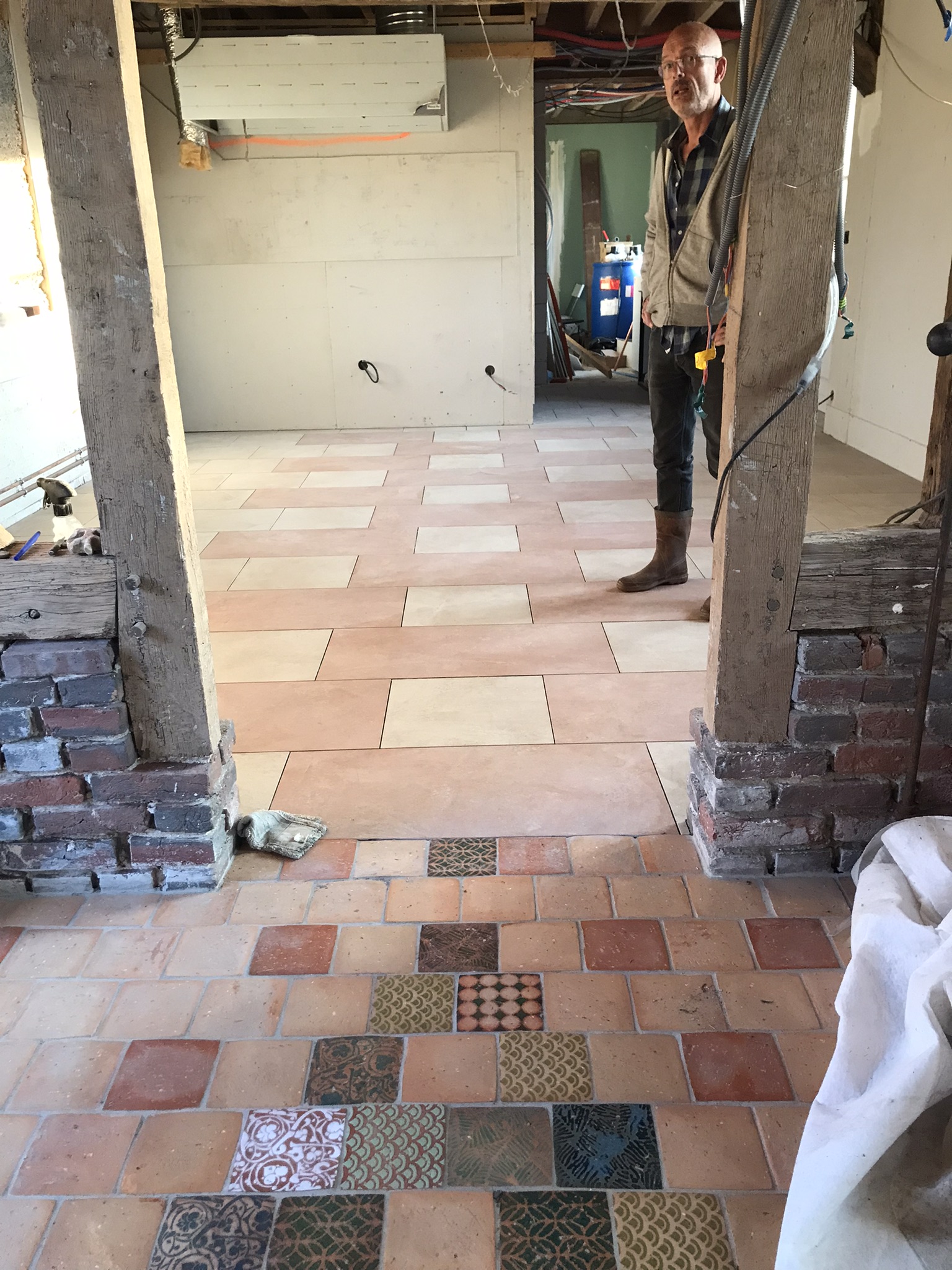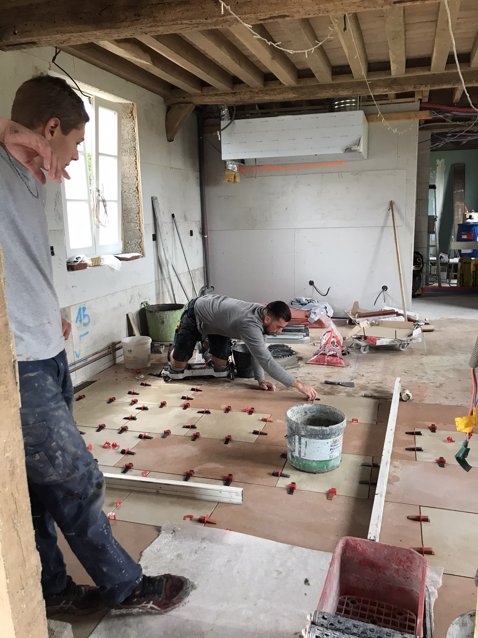 - Le carrelage de la cuisine est posé dans le futur atelier cuisine et la laverie, les joints seront faits demain.