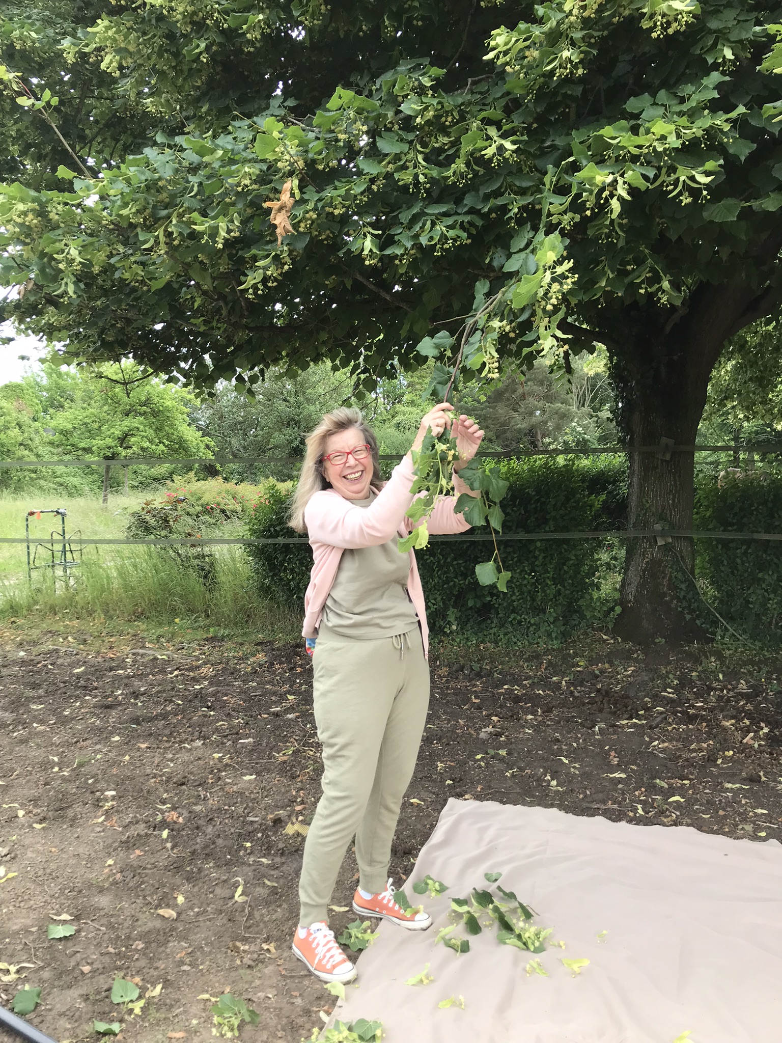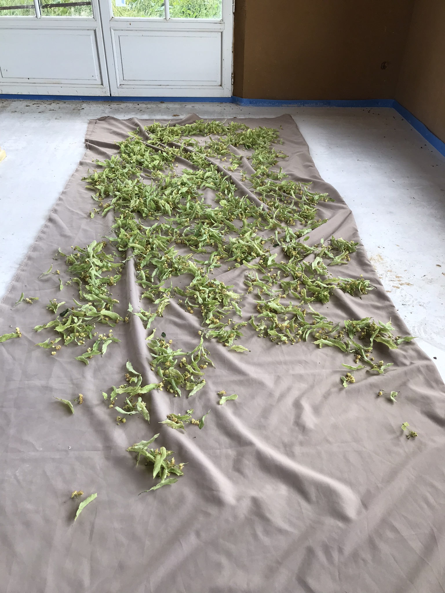 A trois, nous avons fait une première récolte de tilleul, modeste au regard du potentiel représenté par les 40 tilleuls récoltables chez nos hôtes. Si quelques bénévoles sont prêts à contribuer, nous pourrions en ramasser bien plus dans les prochains jours. Ce tilleul, ainsi que les fleurs de camomille et feuilles de mélisse également récoltés, constituent une base pour des tisanes futures au bar de Terre-Tous.