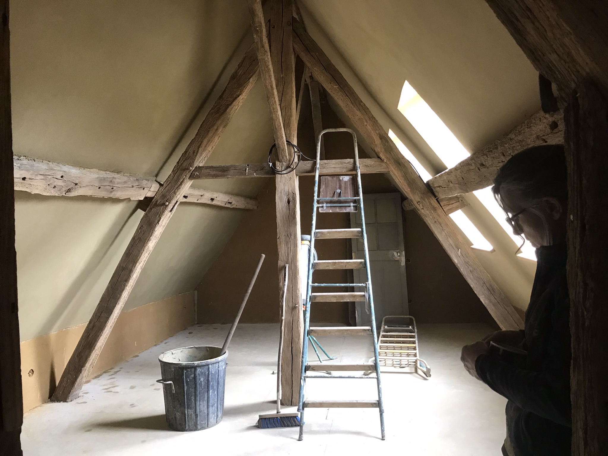 - La finition en terre des rampants de l'étage se poursuit. La pose du parquet peut maintenant se faire avant l'enduit terre sur les parois verticales.