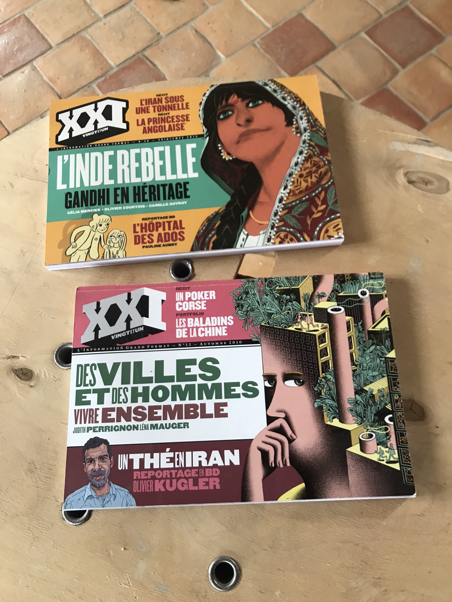 - Isabelle C. a déposé à TT des exemplaires de la revue XXI. C'est une revue de reportages, indépendante et sans publicité. Conçue sur le terrain par des journalistes, écrivains, illustrateurs, photographes de la bande dessinée. Vous pouvez venir les consulter dans le canapé;).