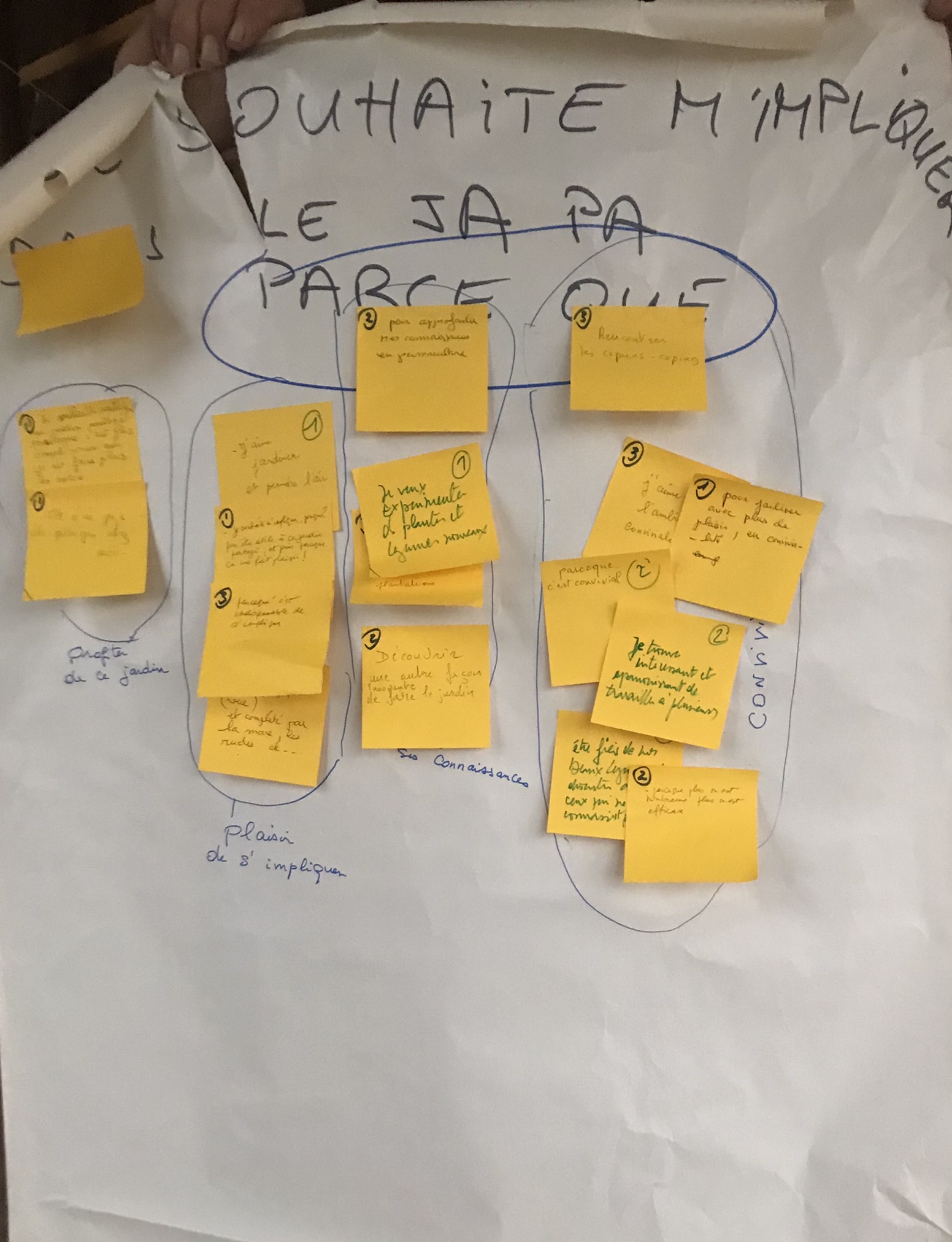 - Samedi, une rencontre avec une partie des volontaires habitués du jardin a permis de partager nos ressentis et besoins quand nous venons au jardin partagé. Ce fut un moment différent, parce qu'on n'est pas obligé de ne parler que jardin quand on se retrouve;). Nous avons tout de même conclu qu'il était utile de rendre visible sur un tableau les travaux possibles au jardin chaque semaine, d'étudier le démarrage d'une serre, et de préparer des tuteurs costauds pour les tomates et les haricots, et aussi afficher un calendrier annuel pour que chacun puisse être pro-actif, et que nous n'oubliions pas de planter les poireaux avant le 15 Août !