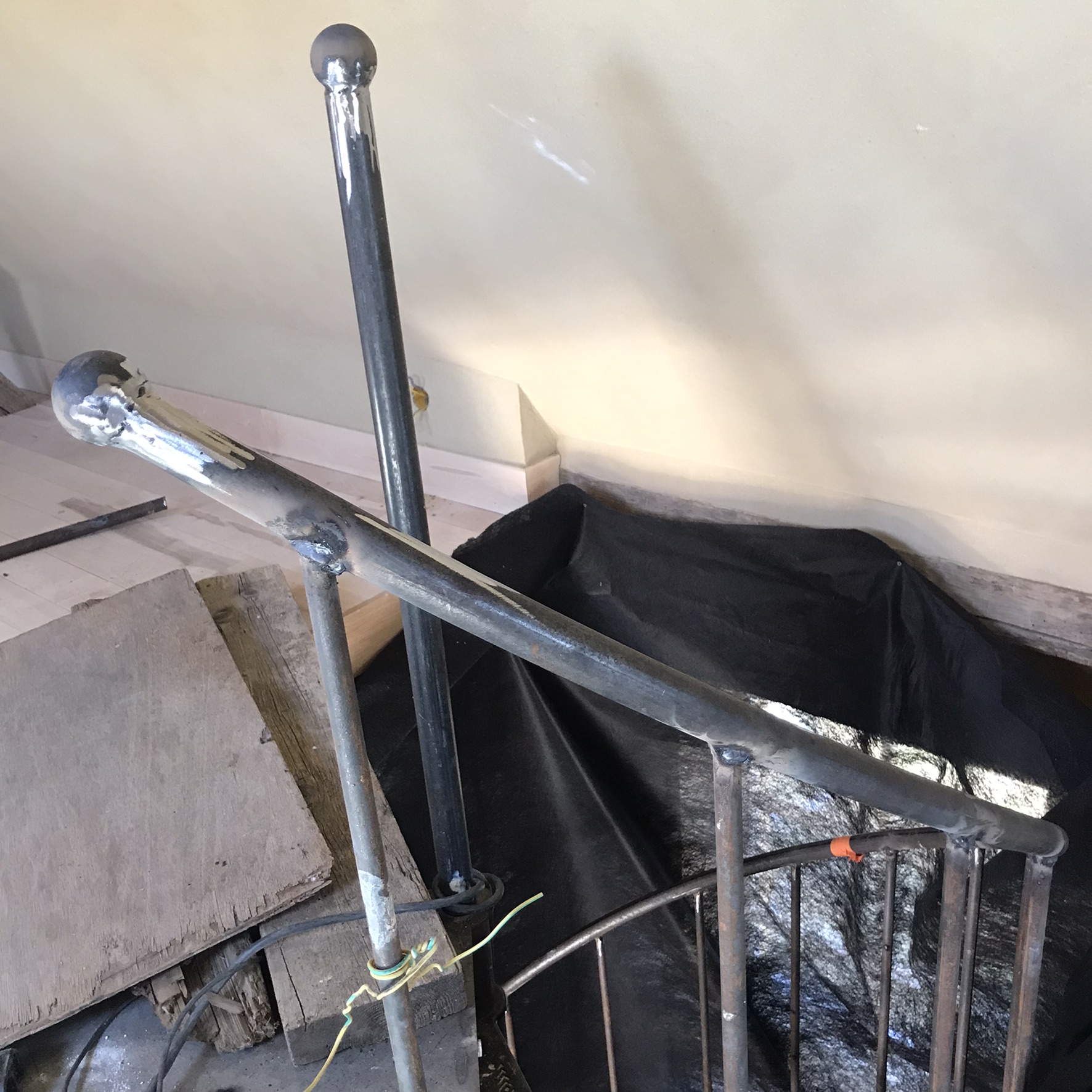 - France et Christophe ont fini de fixer la rampe de l'escalier, il reste à poncer les éclats.