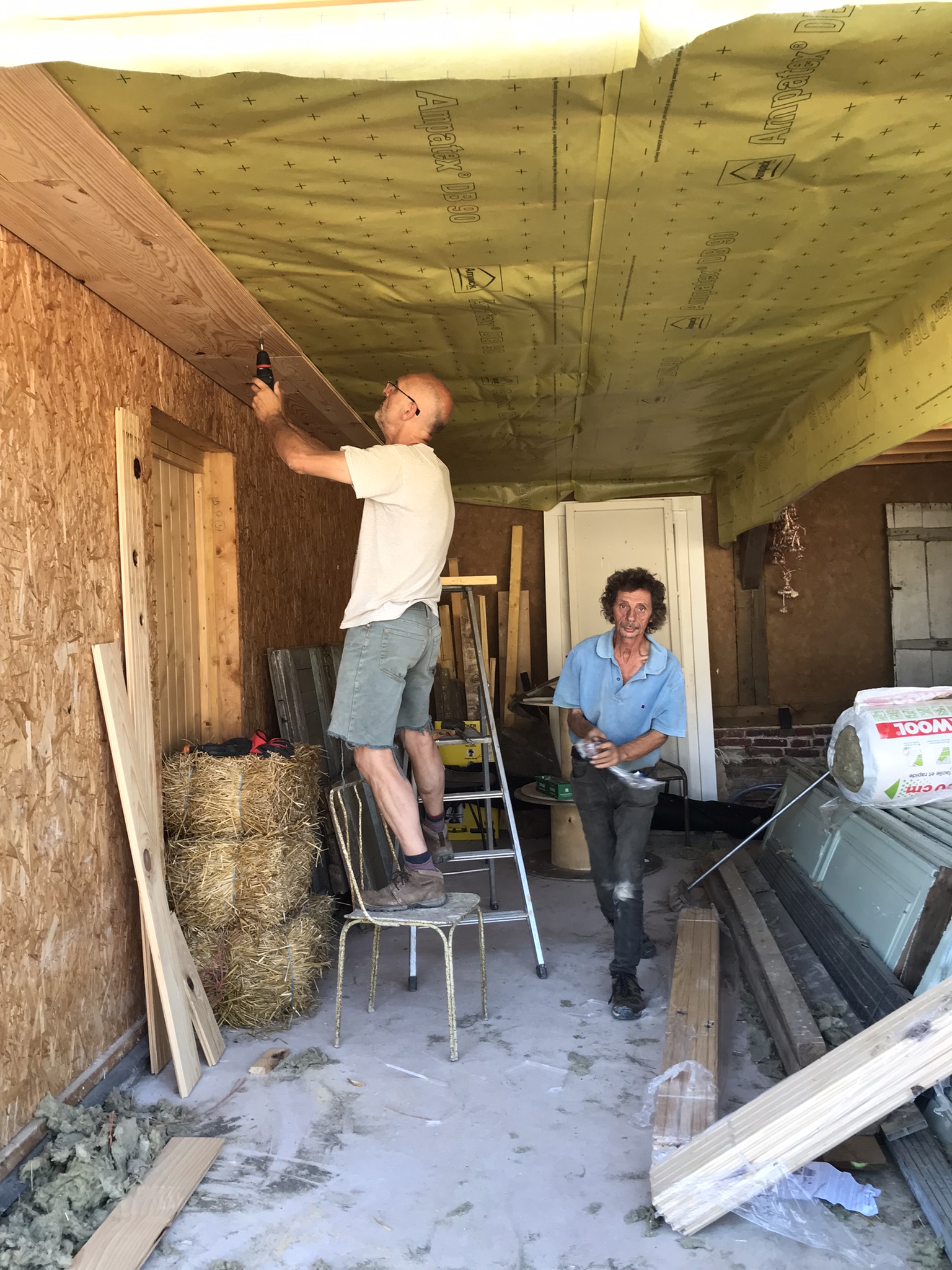 - Christophe et Manu ont démarré l'isolation du plafond du garage.