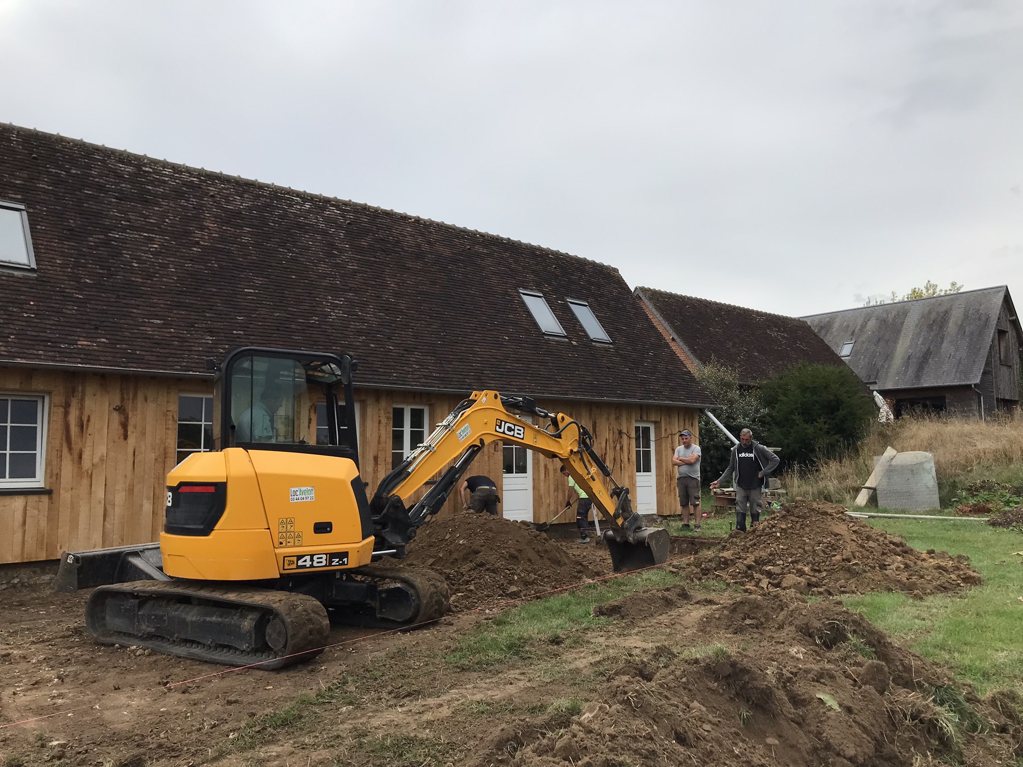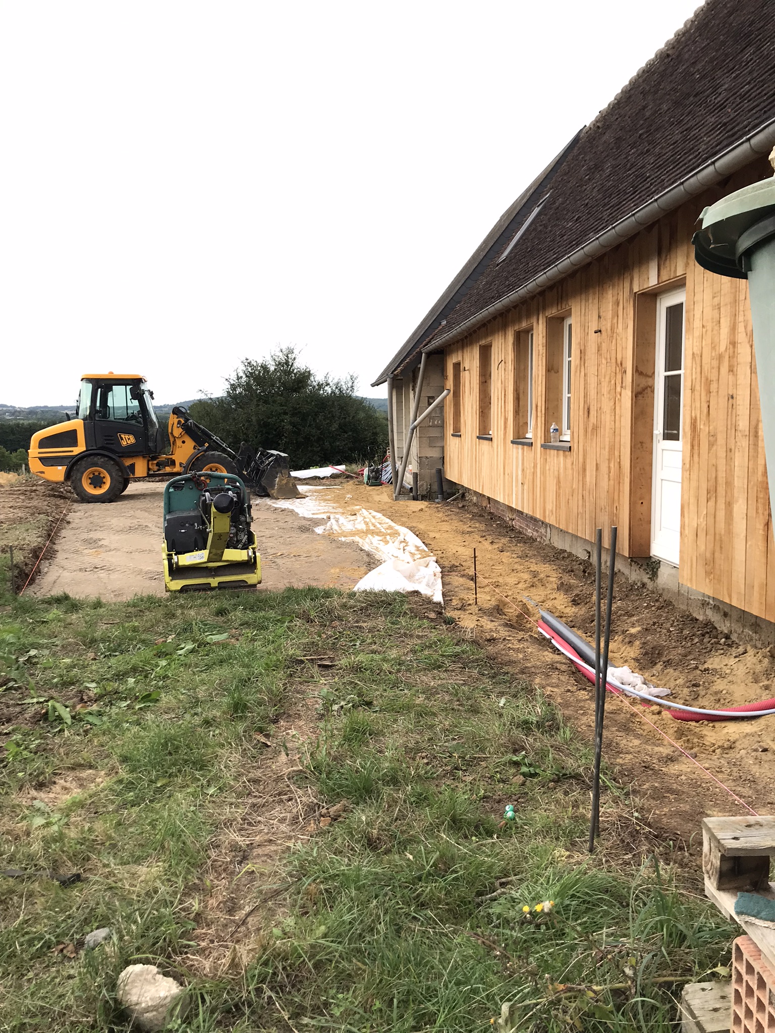 - Surprise de Christophe, les terrassiers ont préparé les fondations de la terrasse et du cheminement menant jusqu'aux toilettes, par un compactage de graves naturelles. On voit bien ce que ça pourra donner comme espace autour de la maison.