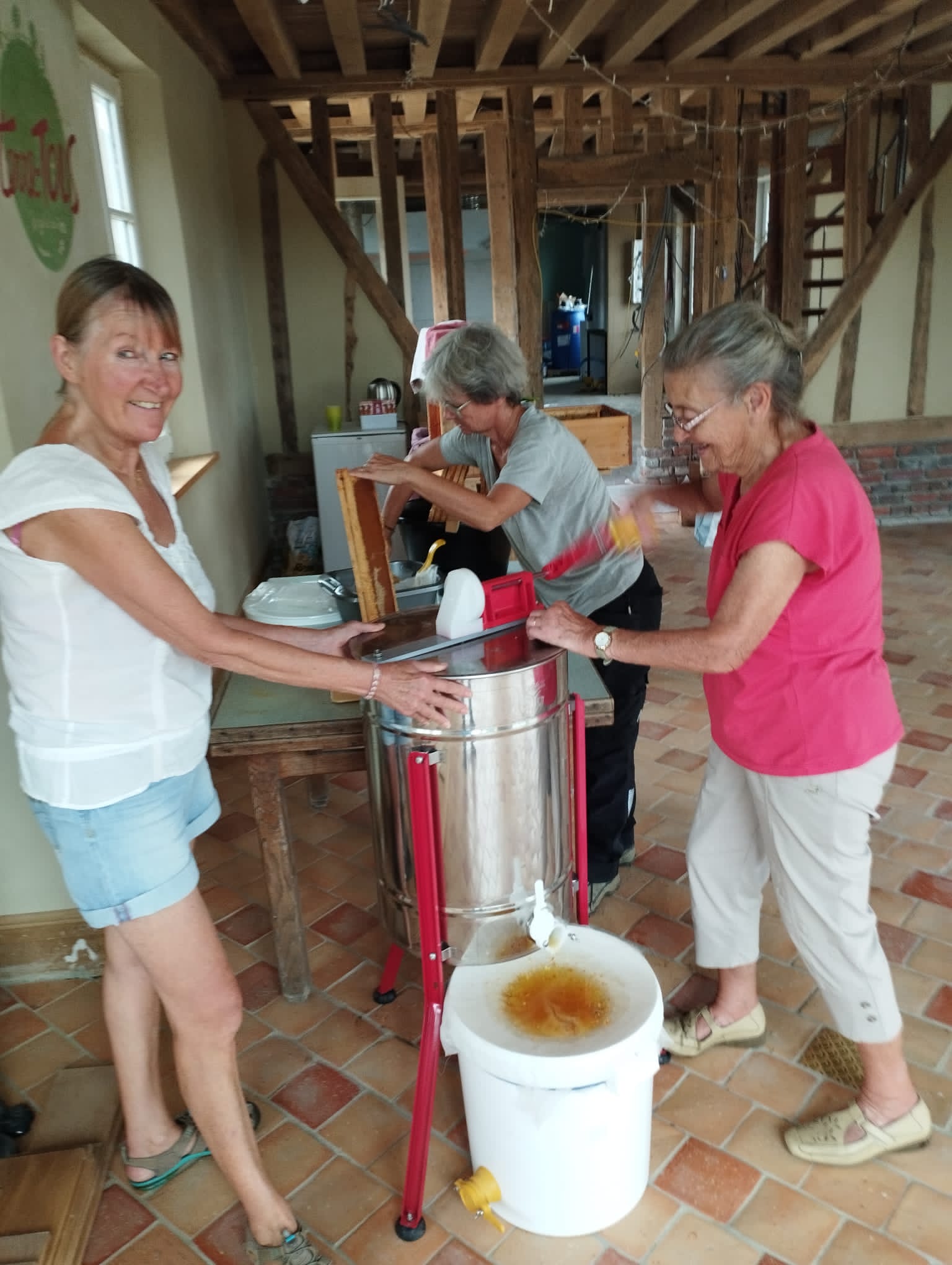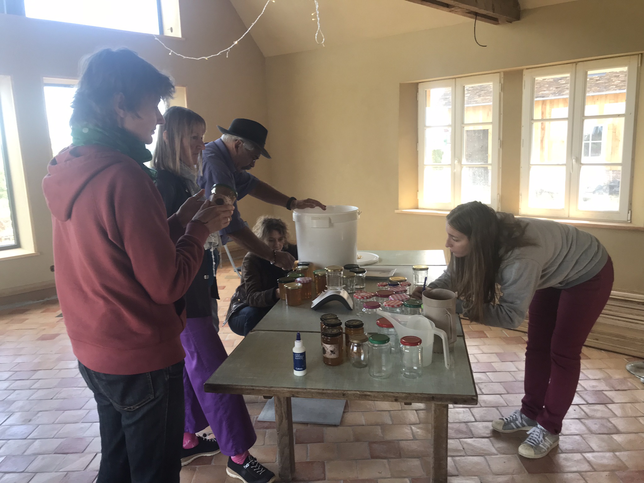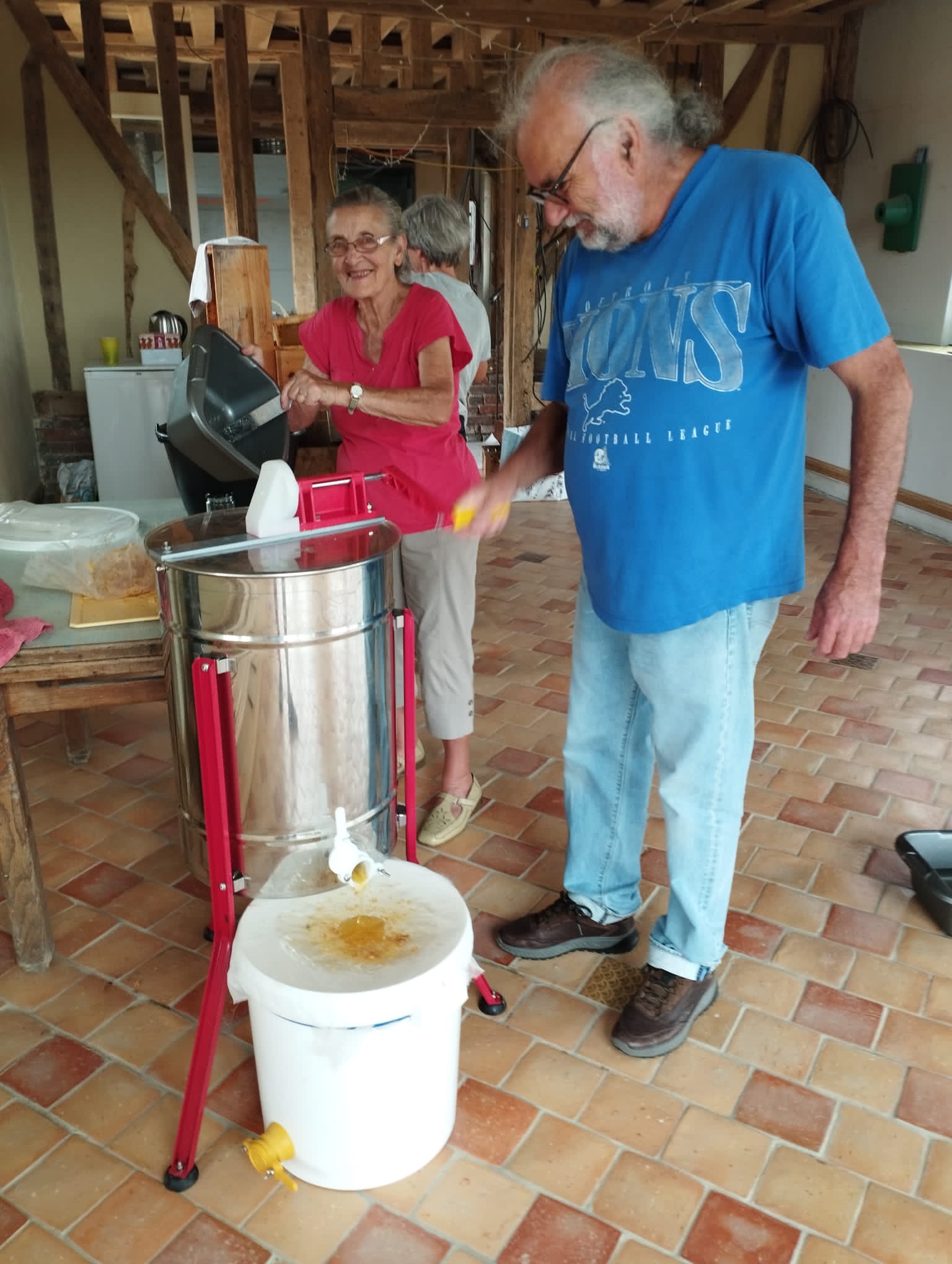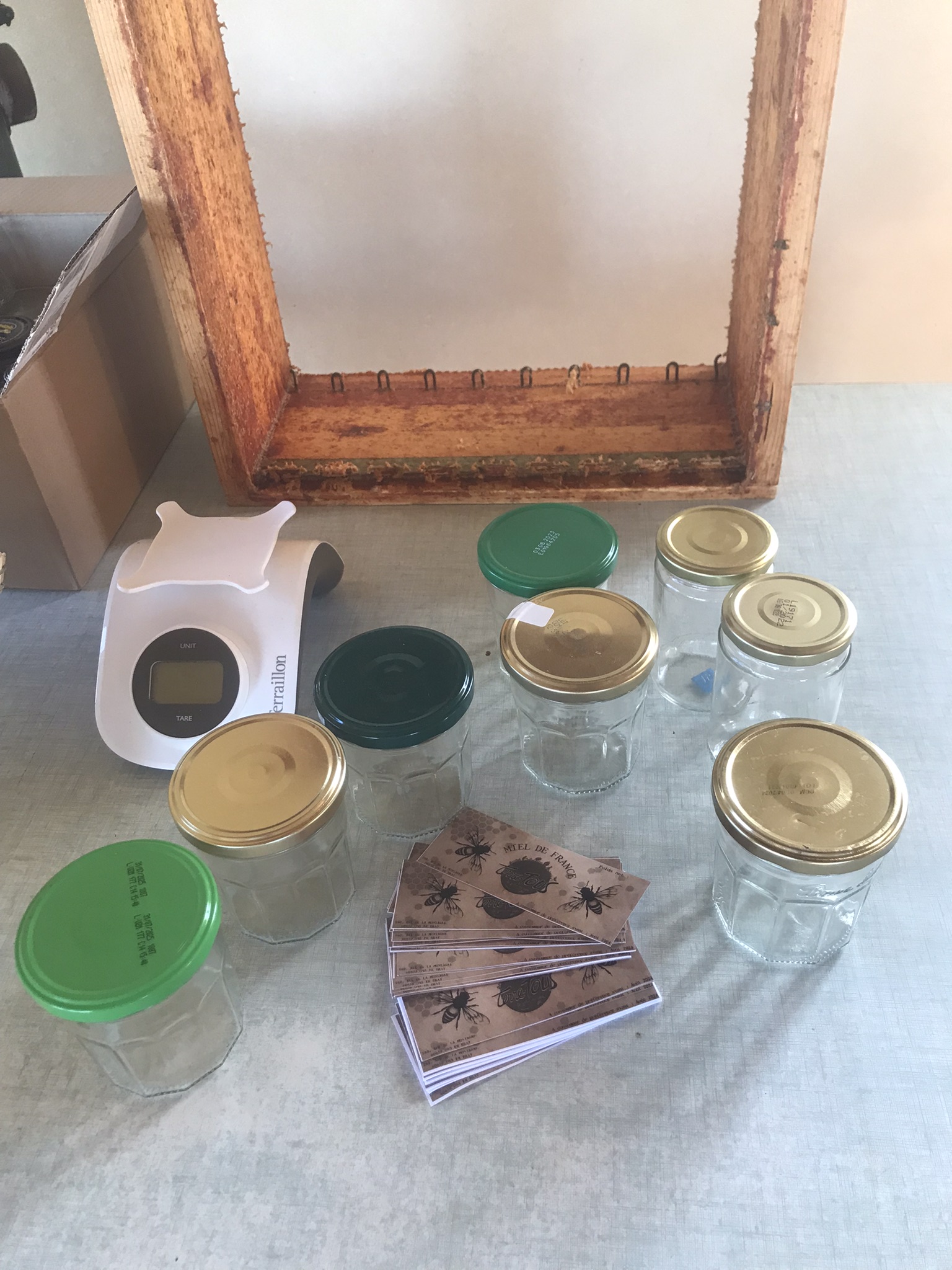 - Abeilles, ruche et miel : malgré la pression forte des frelons, nos abeilles ont donné une belle hausse pleine de miel, la deuxième de la saison, elle a été extraite et mise en pots de mains de maîtres cette semaine. Tous nos pots sont maintenant étiquetés en bonne et due forme et nous vous en avons gardé si vous voulez en acheter. Stocks limités! !
