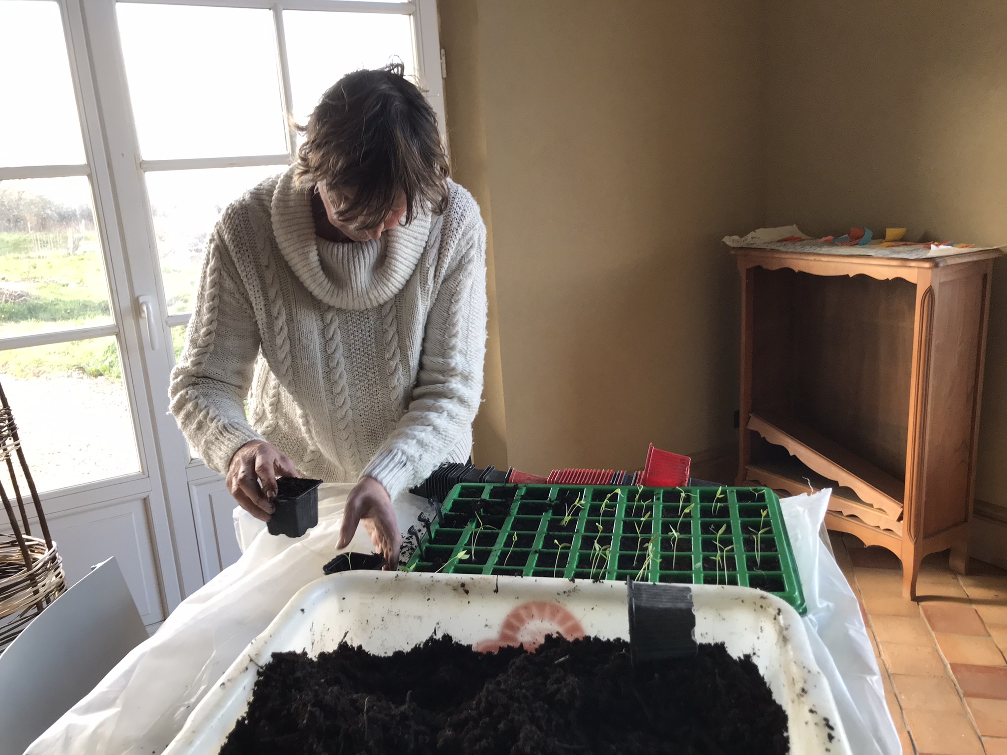 - Les poivrons et aubergines ont été repiquées en pots devant la baie, pour que la vue les inspire !