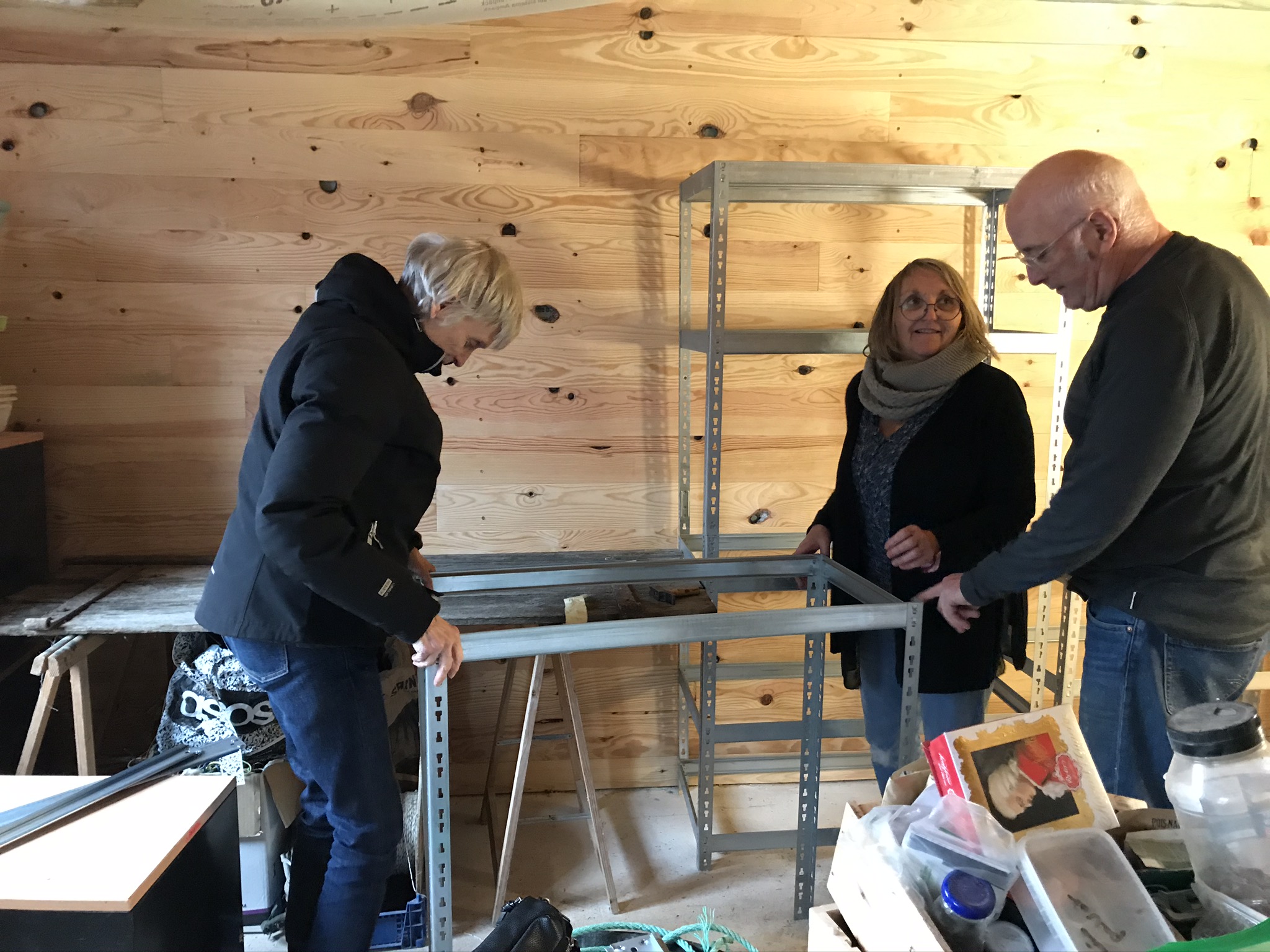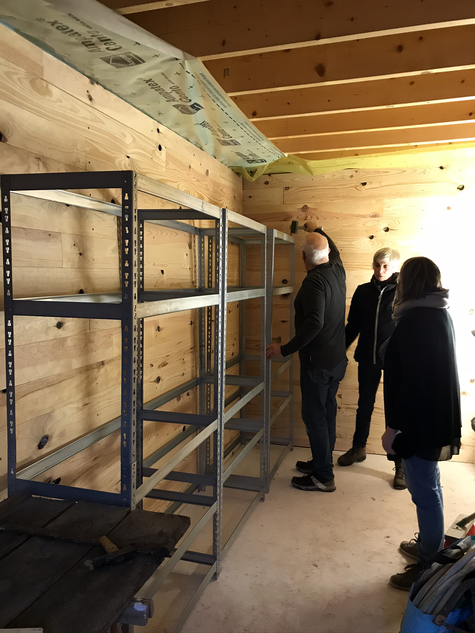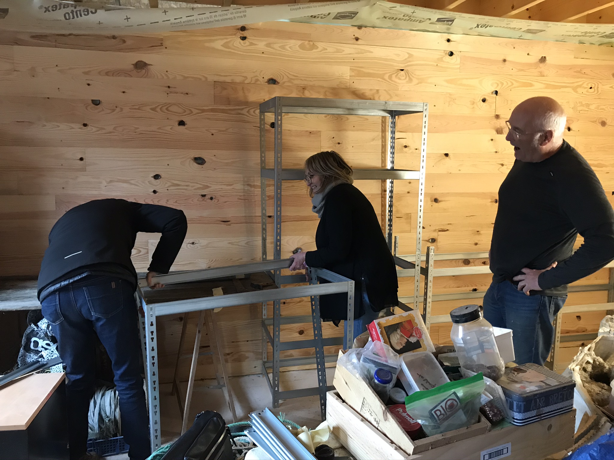- Sylvie, Fred et Mijo ont mis leurs talents à contribution pour monter les étagères de l'atelier (notice en allemand...). Si les planches de bois n'étaient pas plus large de 1mm que nécessaire, nous pourrions déjà ranger dessus. Bravo aux monteurs !