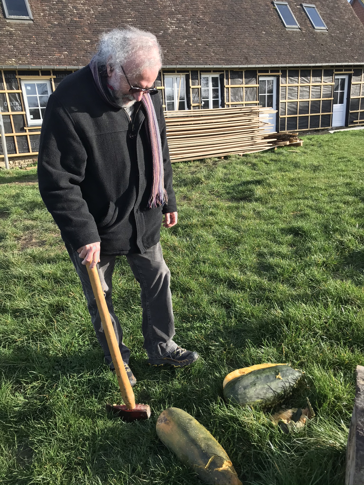 - Les énormes courgettes de l'an dernier, conservées pour récupérer leurs graines, montraient des signes de décomposition alors avec Chantal et Dominique, nous les avons ouvertes et en avons récupéré les graines bombées.