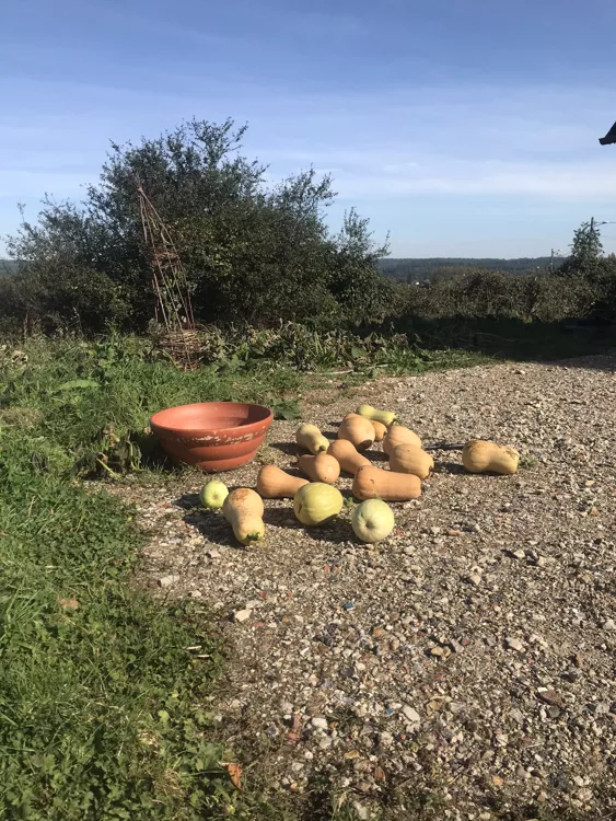 Si les framboises n'ont pas bien résisté aux fortes pluies, le céleri rave et les radis en ont bien profité. Les courges sont rentrées ; il paraît qu'il faut attendre un peu que le goût des butternuts mûrisse avant de les consommer.