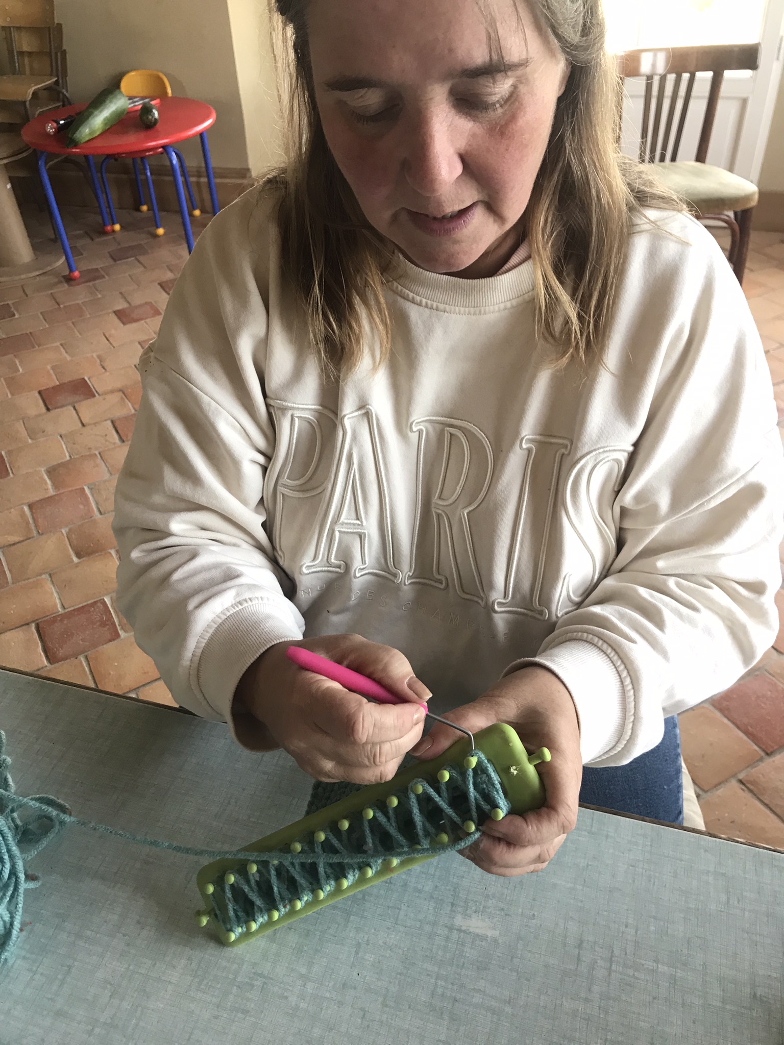 Isabelle nous a montré son utilisation du tricotin pour réaliser bonnets et capelines.