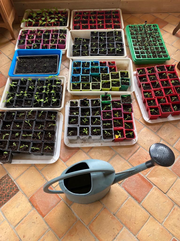 - Encore des semis pour le potager cette semaine : concombres, courgettes, courges en tous genres. Et des repiquages de tomates. La surface de carrelage occupée par les bacs dans la pièce principale augmente...