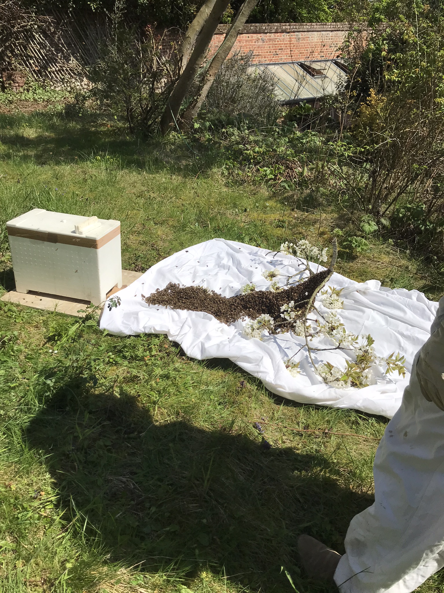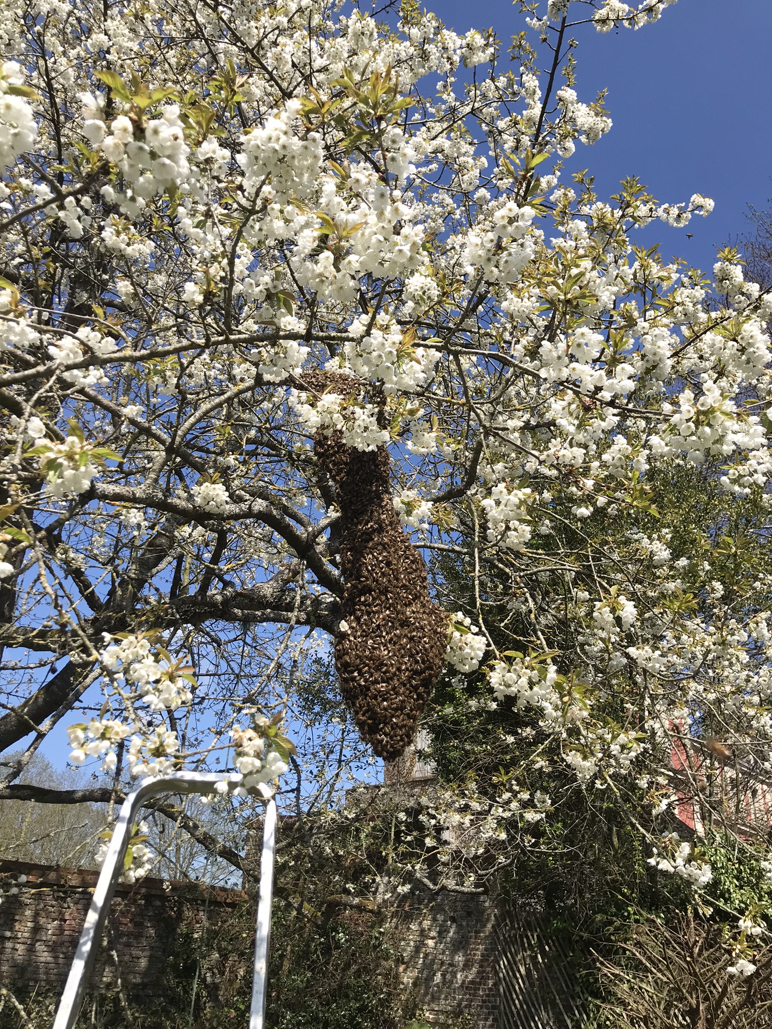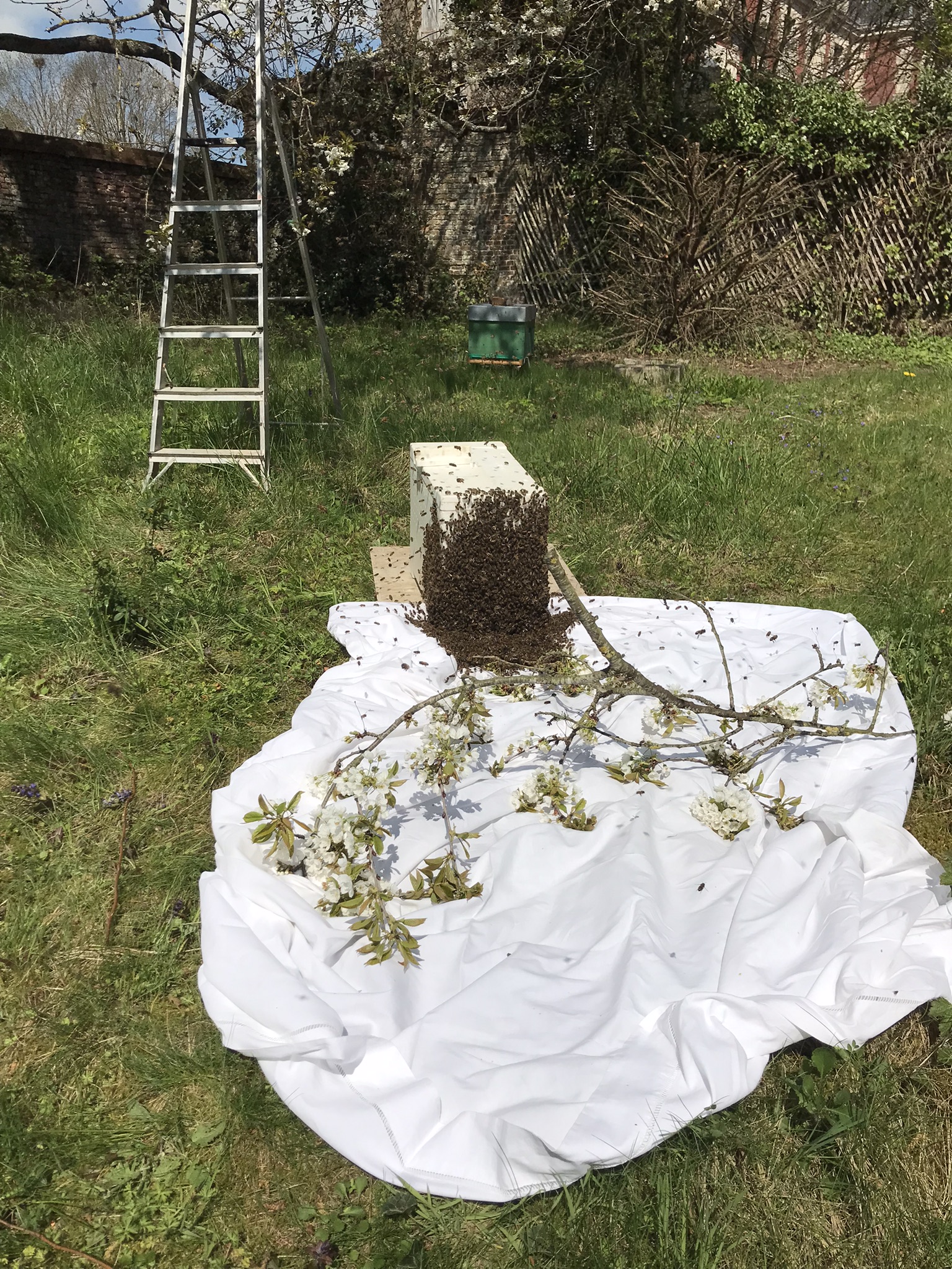 - Bien entendu, si vous voyez un essaim se poser chez vous dans le jardin en attendant de trouver son futur lieu de villégiature, appelez nous pour qu'on vienne le récupérer. Il faut agir en général dans les heures qui suivent son départ de la ruche d'où il a essaimé.