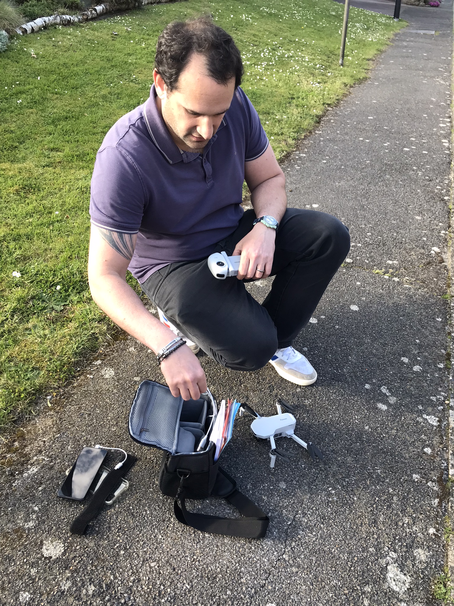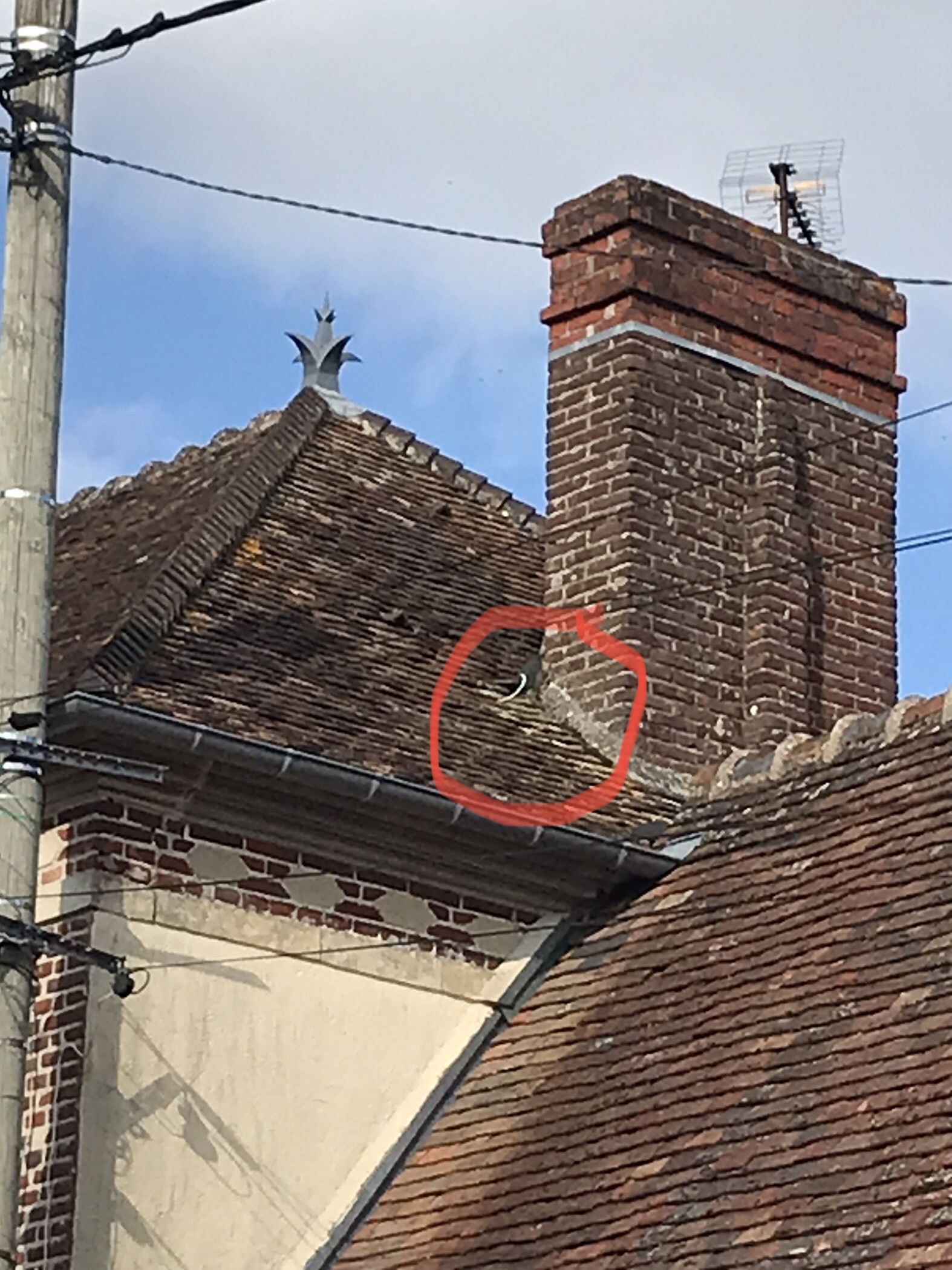 Abeilles : - Ma ruche perso a essaimé ce mercredi, d'un gros essaim que nous avons un moment capturé dans une ruchette en vue de l'installer à TT... avant qu'il ne trouve l'endroit pas à son goût (que des cadres neufs, aucune odeur probablement) et s'échappe à nouveau...Alain l'a vu passer rue de la montagne dans un grand bruit, puis Chantal l' a entendu et vu se poser sur son toit, avant qu'il ne disparaisse dessous, par une entrée que Gabriel nous a aidés à repérer à l'aide de son drône. Elles se sont glissées sous des tuiles proches de la cheminée, mais pas dans le conduit de la cheminée, du coup il ne semble pas facile de les déloger. Les abeilles étant protégées, il ne faut pas les détruire à moins qu'elles ne mettent des personnes en danger. Donc si Chantal, dont la maison a déjà abrité quelques essaims par le passé, n'y voit pas d'inconvénient, elles vont rester là au moins pour la saison. "Encouragée" par ces évènements j'ai ressorti la ruche de TT et l'ai mise à son emplacement afin d'éventuellement attirer d'autres essaims.