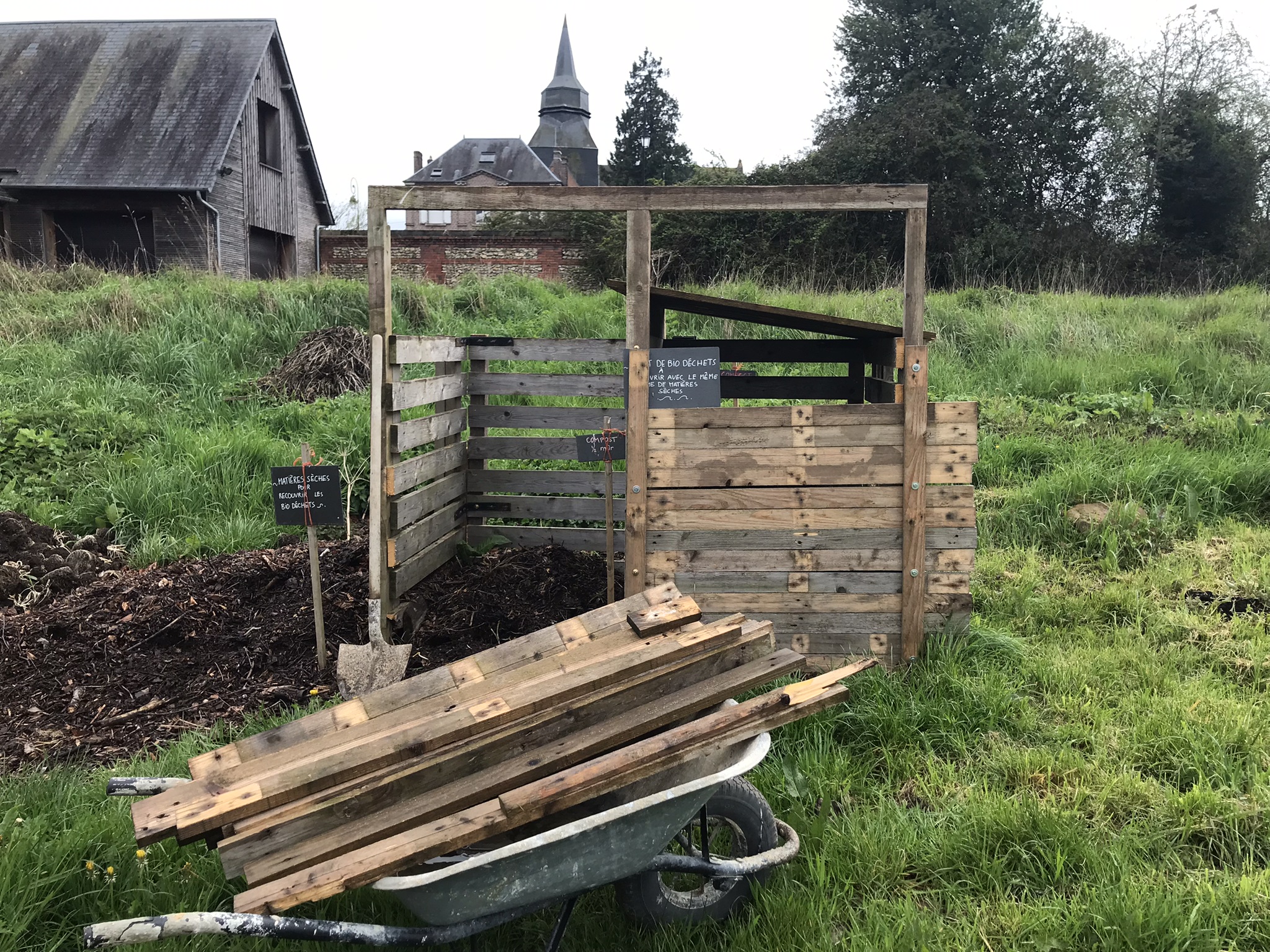 - Avec les planches de palettes démontées grâce au nouvel outil développé par Roland, le bac à compost se peaufine : porte, toit, ça a de l'allure.