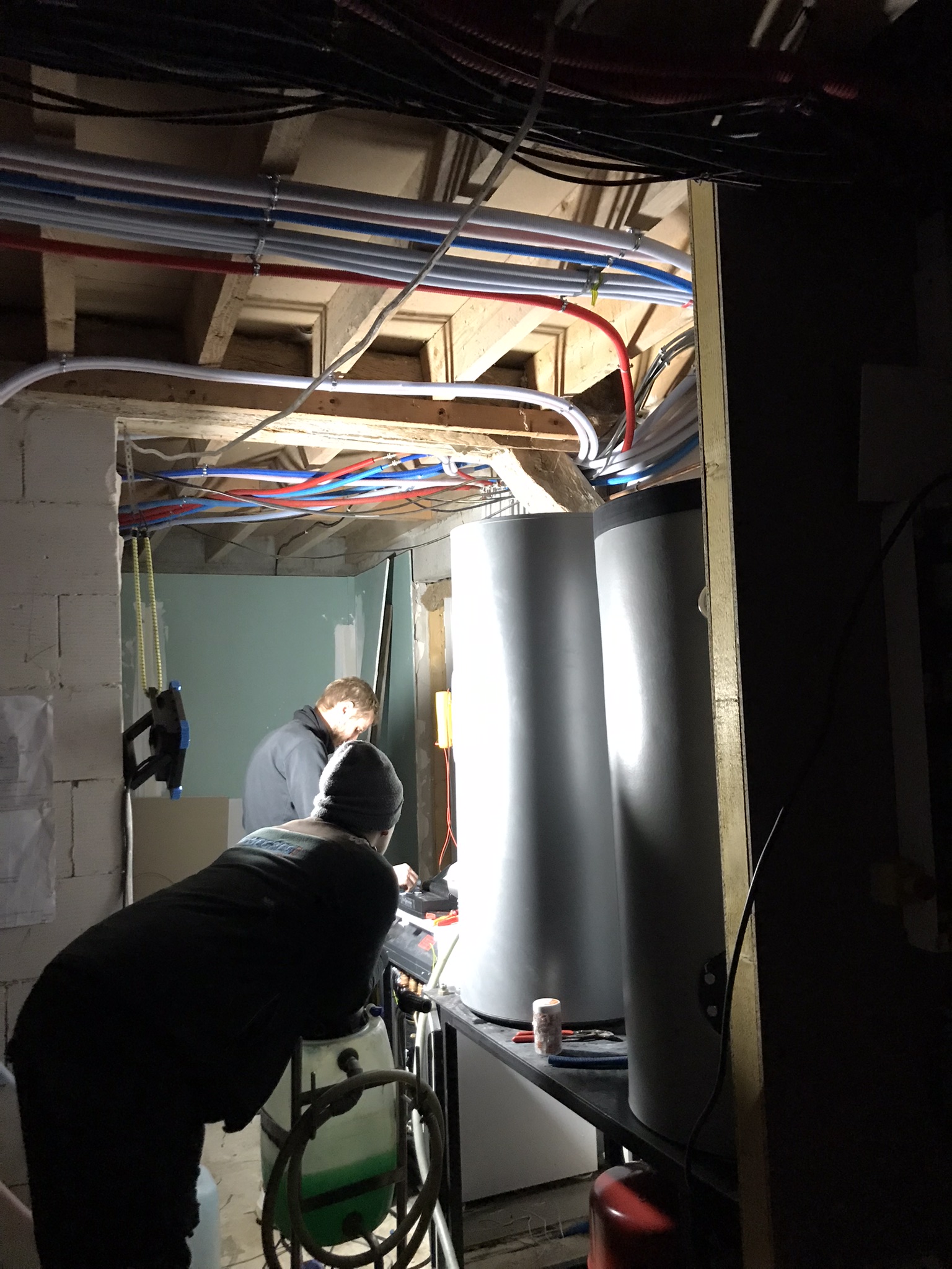 - Chauffage : suite du feuilleton ! Grosse déception en comprenant que le chauffage ne serait pas en fonctionnement jeudi soir... Il y avait beaucoup d'air dans les tuyaux, la concentration en glycol était trop faible, engendrant un risque de gel dans la tuyauterie, et le courant en place (temporaire) n'est pas suffisant.