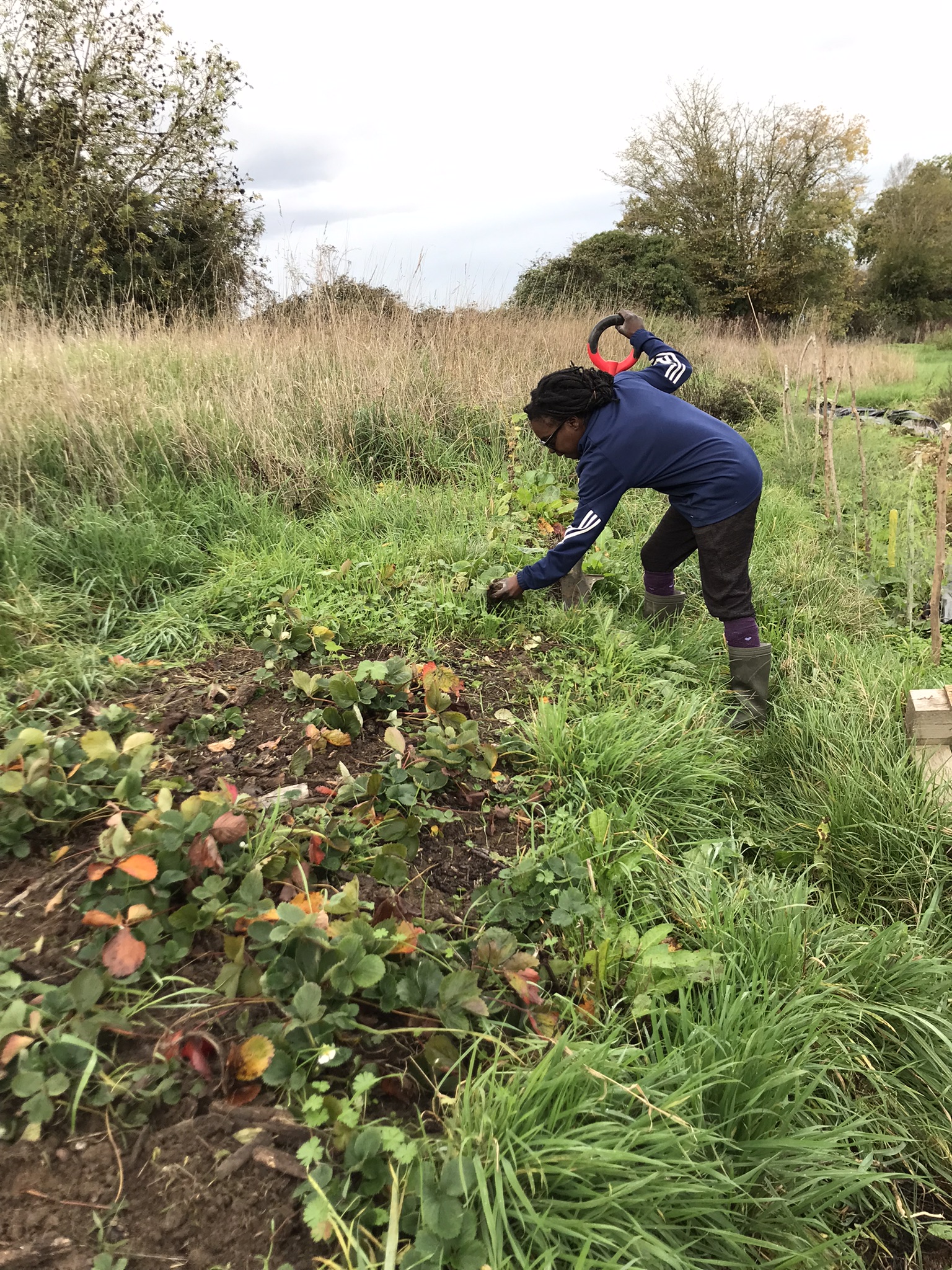 Pépéla, Hugo et moi avons dégagé une ancienne planche de fraisiers pour y planter des bulbilles d'ail récolté cette année. C'est un peu tard pour ce genre de plantation, mais on verra bien.