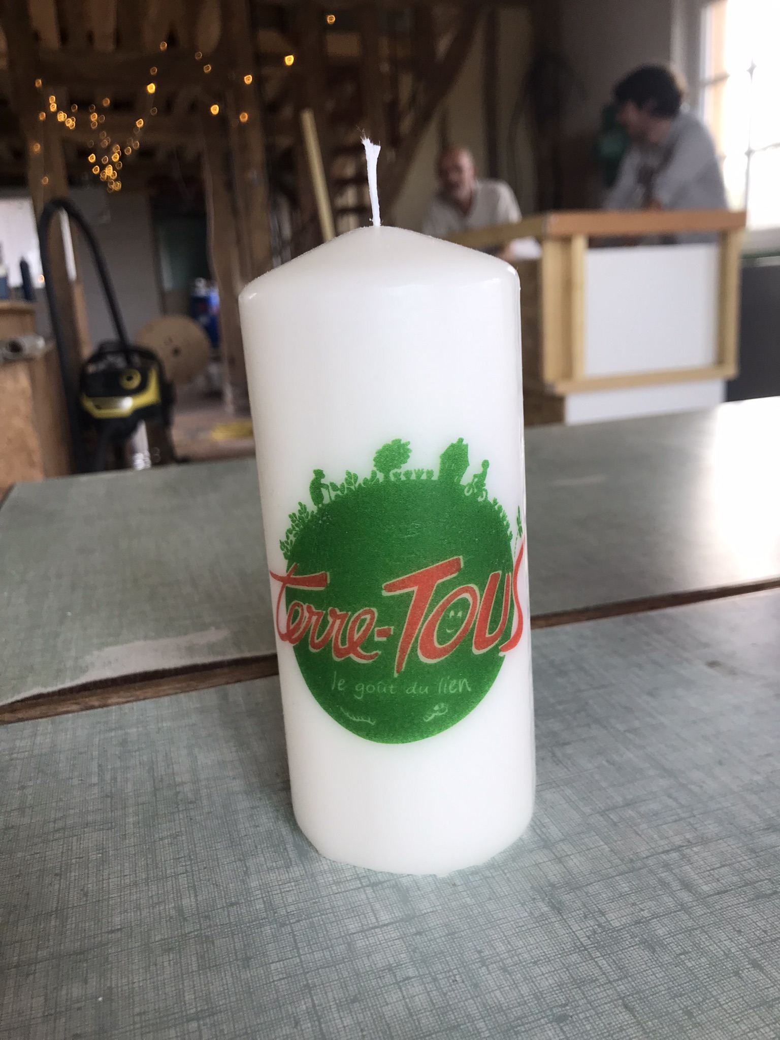 - NAG nous a apporté une bougie imprimée au Logo de Terre-Tous... un début de "goodies" TT !