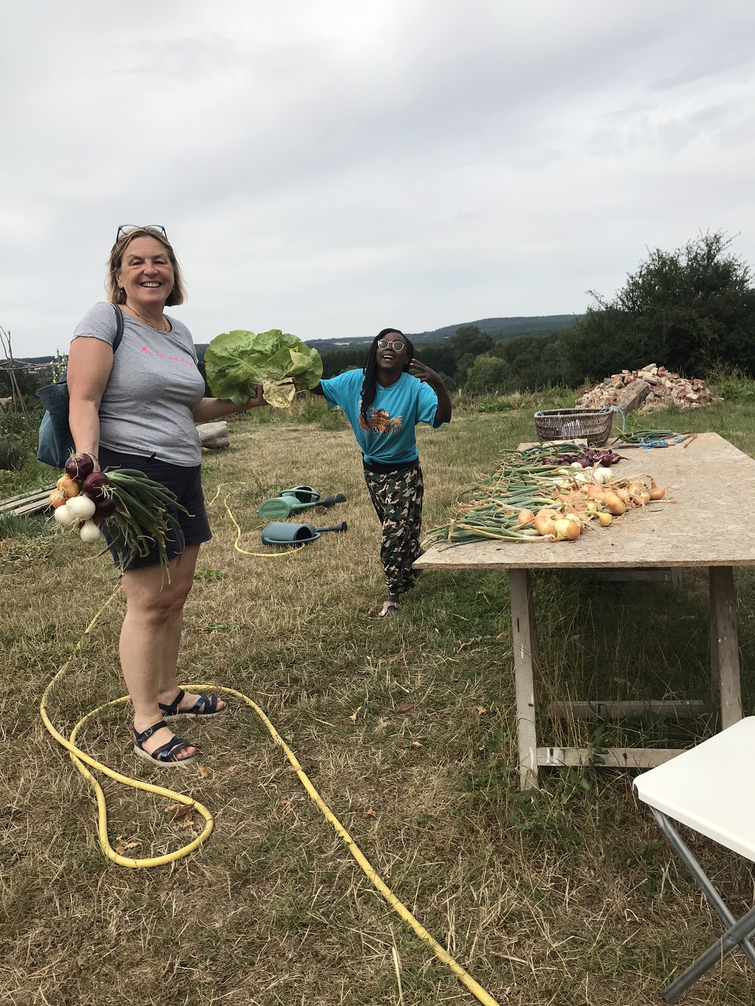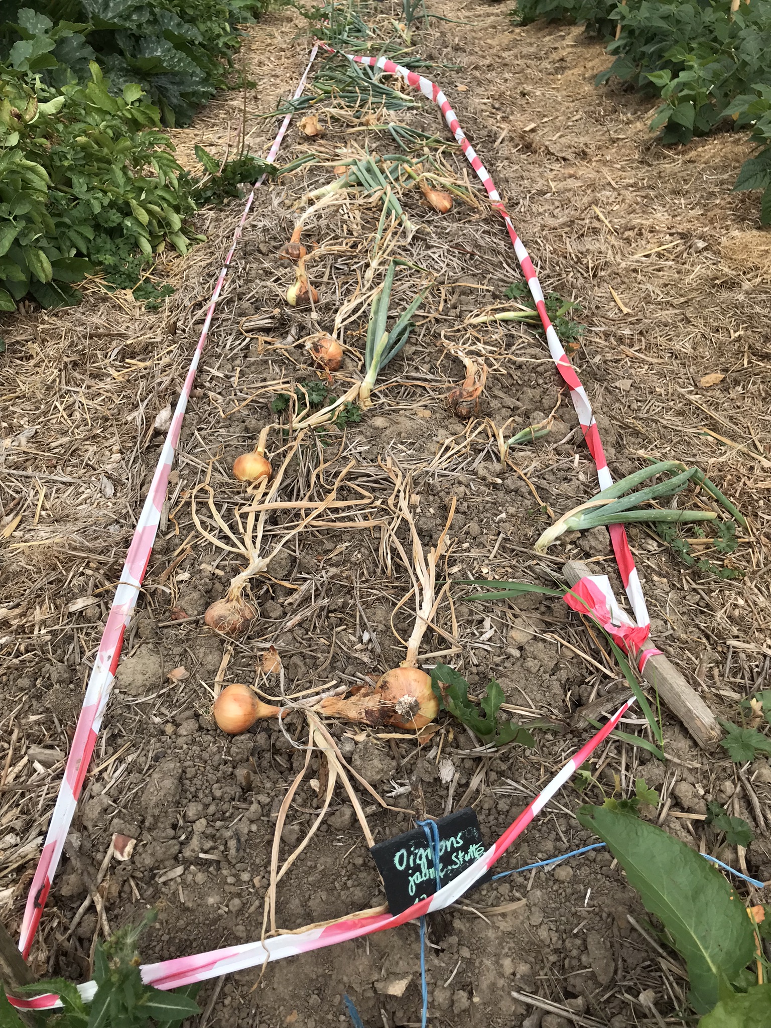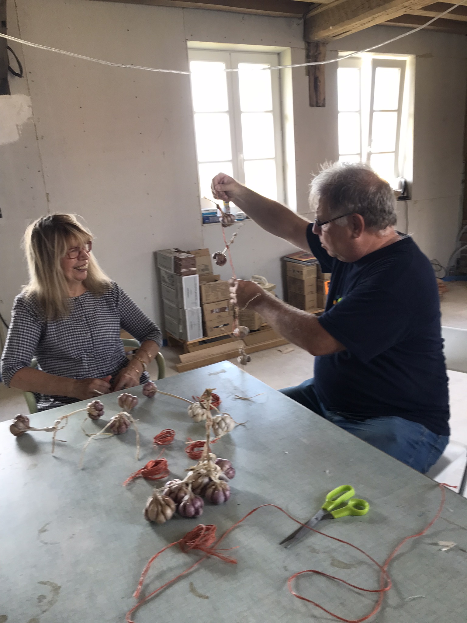8kg d'oignons récoltés, une paire de kilos d'ail tressé avec Isabelle et Laurent, nous allons les conserver pour nos projets d'ateliers culinaires.