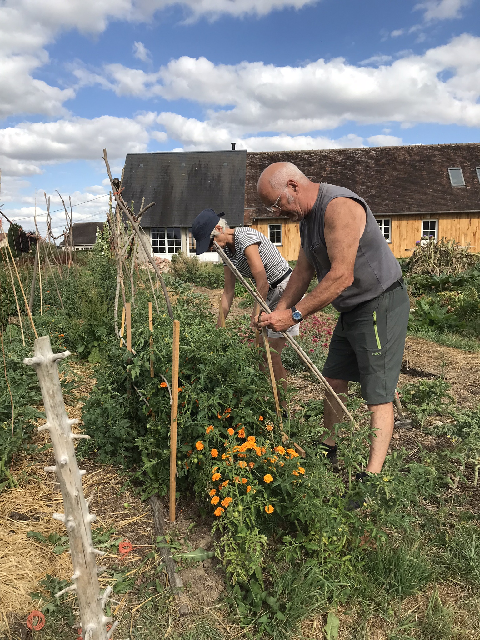 - Récoltes : Courgettes, et concombres : la production est régulière, venez en prendre. Les tomates commencent à rougir, les premières seront récoltées cette semaine si les oiseaux assoiffés ne les grignotent pas. Les tomates cerise sont contenues entre des treillis bricolés par Fred et Mijo.