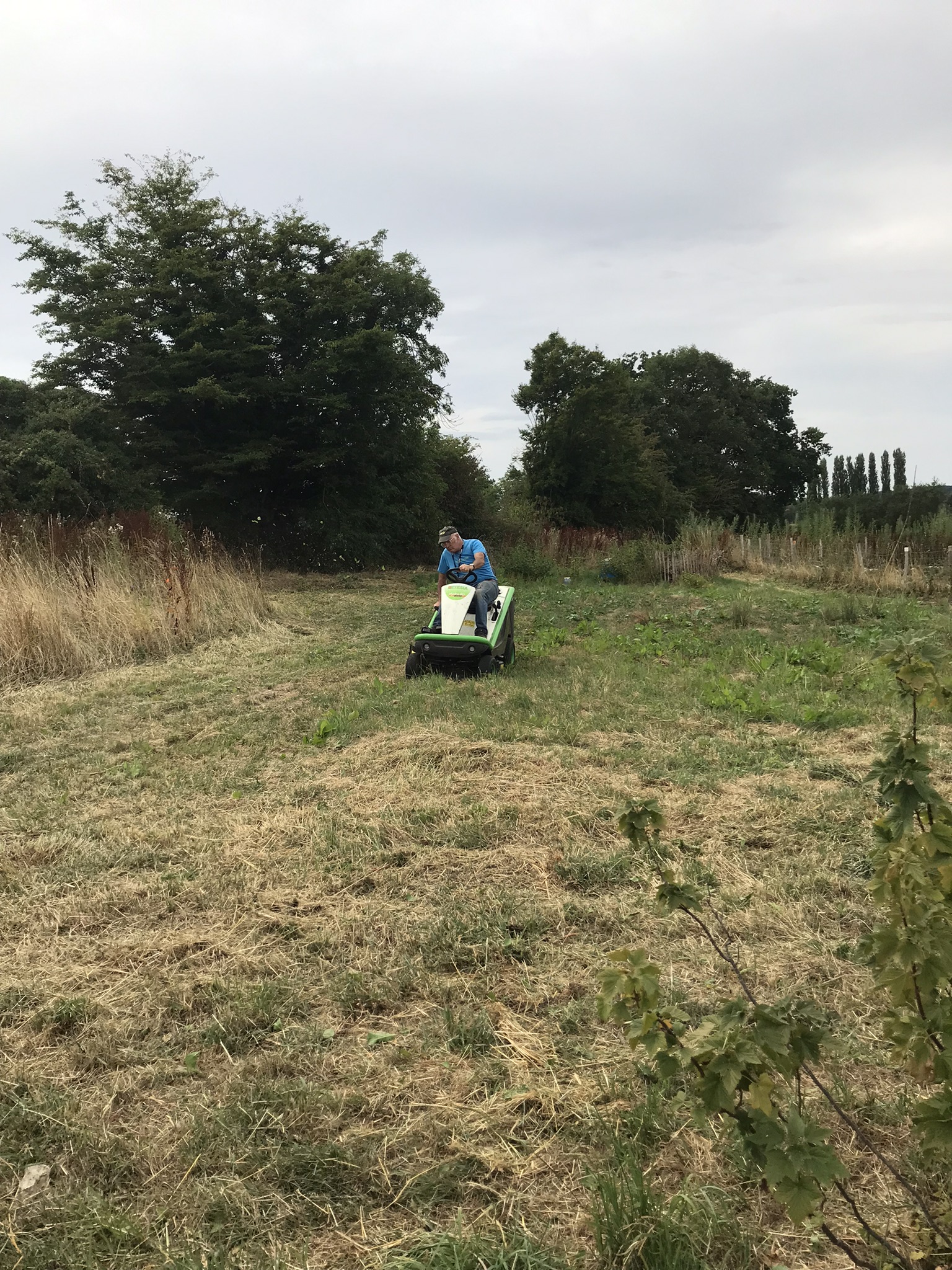 - Fred est venu avec son tracteur tondeuse en remettre un coup sur la partie du terrain déjà tondue il y a un mois. A force, le rumex oseille va-t-il s'épuiser ? Et miracle (n'exagérons rien quand même), nous avons enfin reçu la batterie de notre débroussailleuse et avons donc pu fignoler le travail.