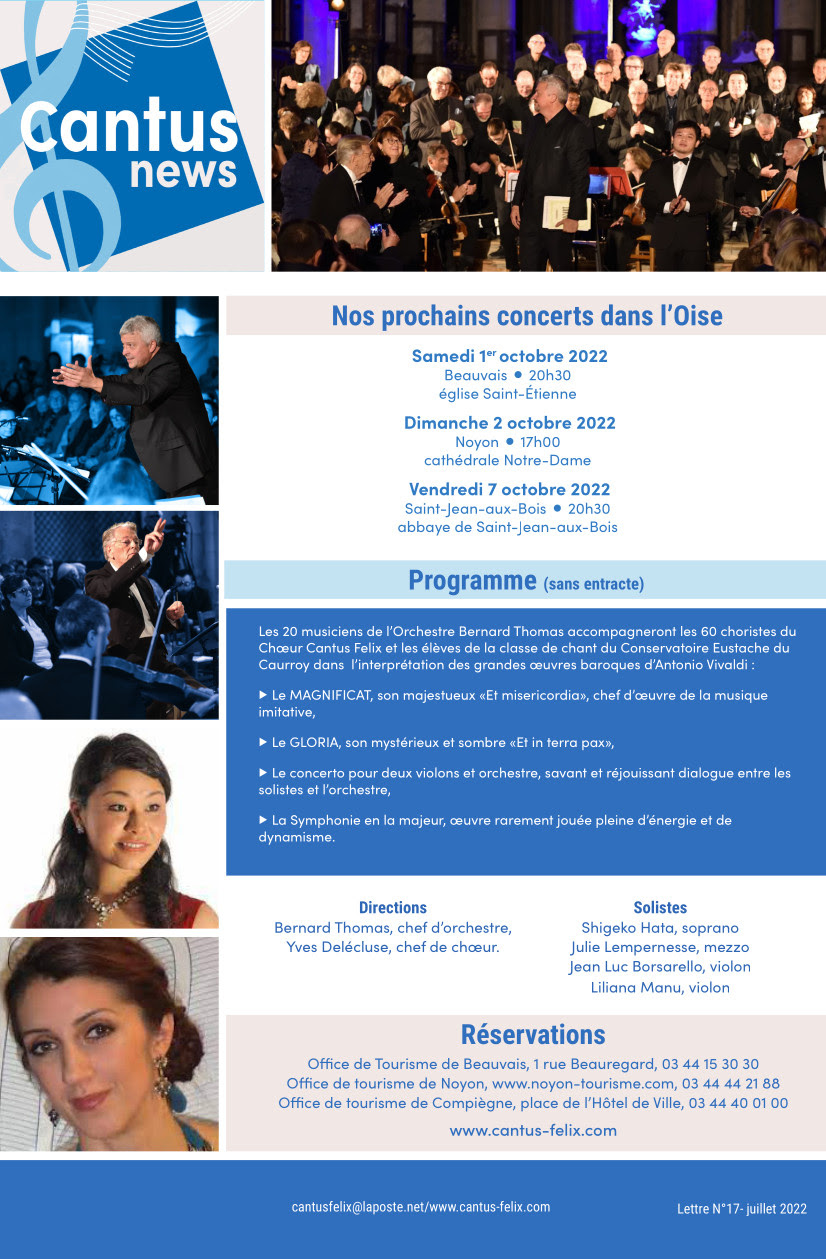 le 01er Octobre à l'église St Etienne de Beauvais, concert de la chorale Cantus Felix (amateurs de Beauvais). Voir affiche jointe