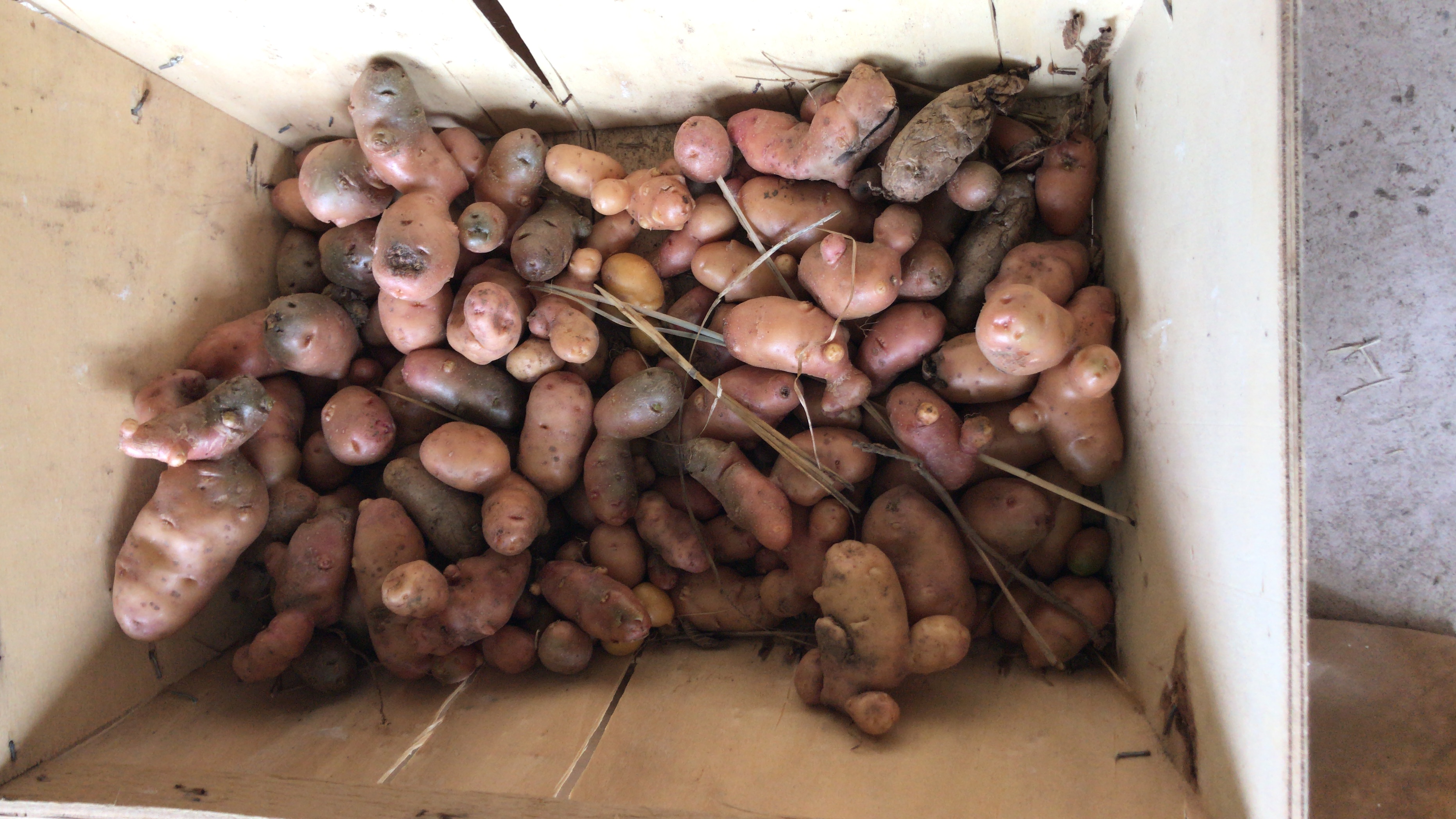 Le premier essai de récolte de pommes de terre a montré à quel point la terre était dure en profondeur dans cette partie du jardin où nous n'avions pas encore apporté des biodéchets. La récolte s'annonce maigre, tout comme celle des mûres.
