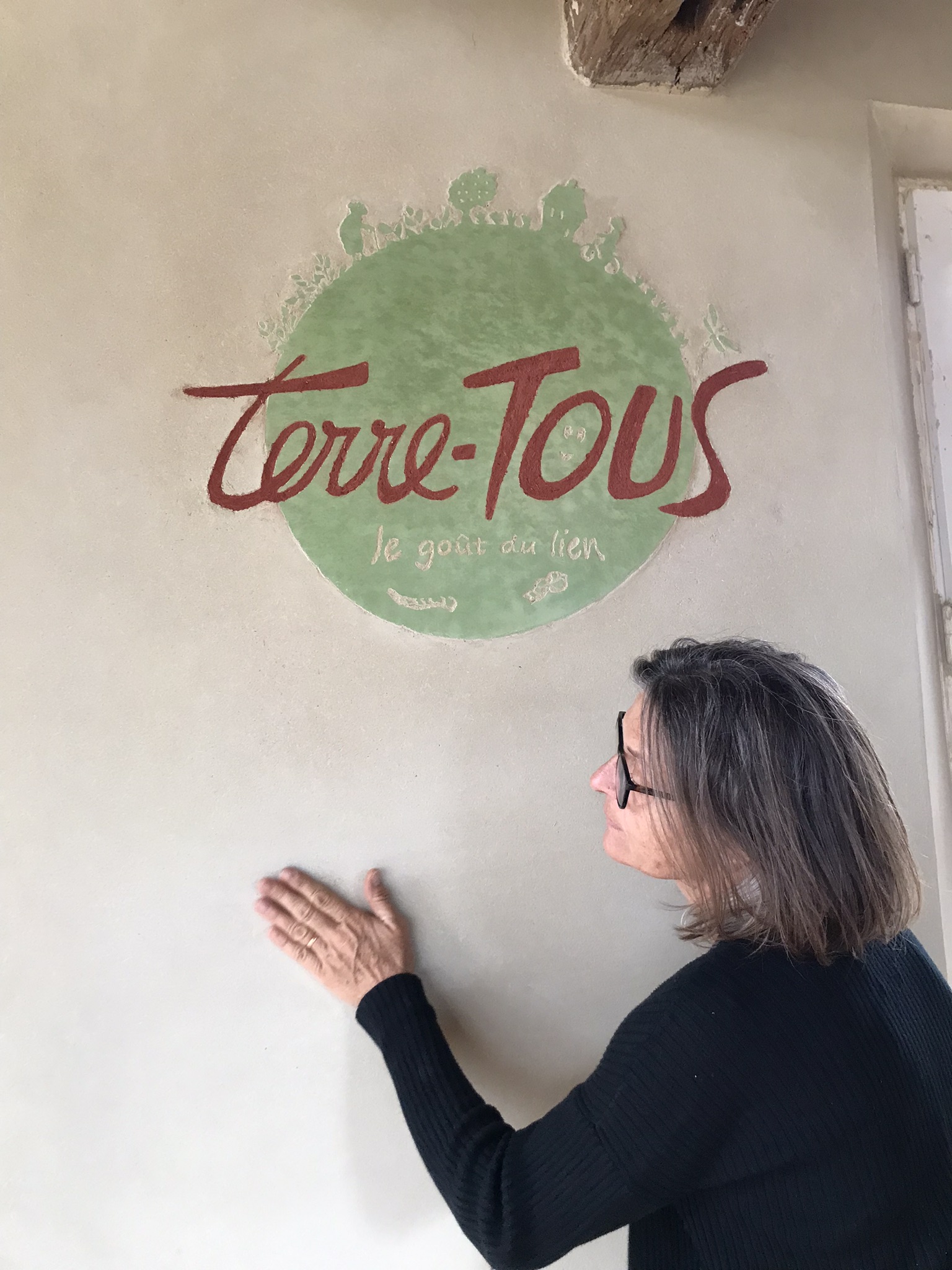 - Isa a terminé le logo de Terre-Tous en tadelakt. C'est vraiment beau sur ce mur clair.